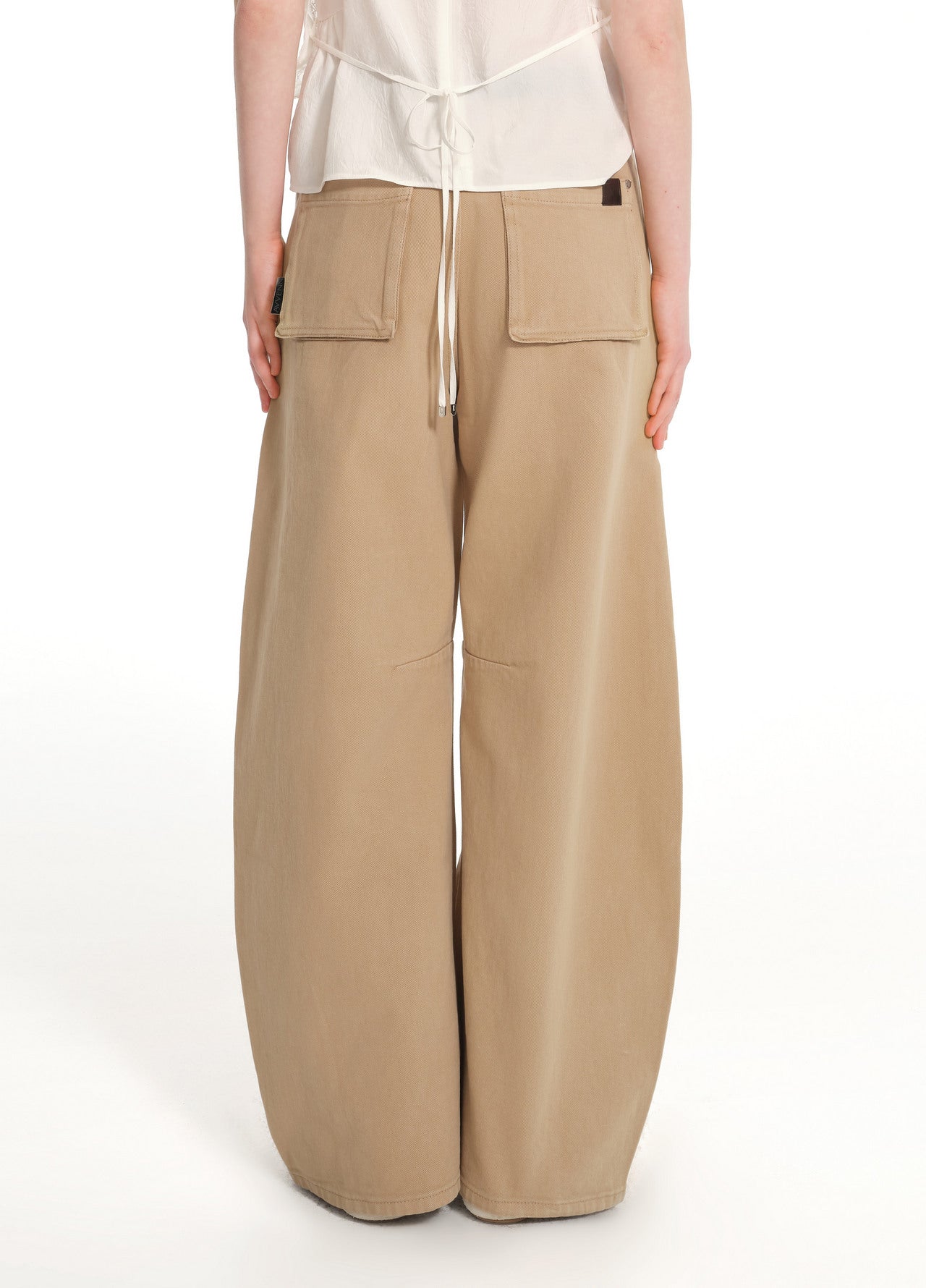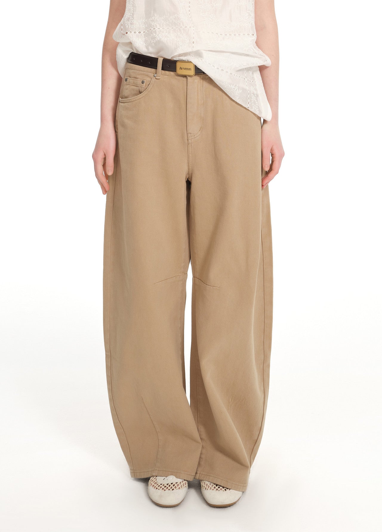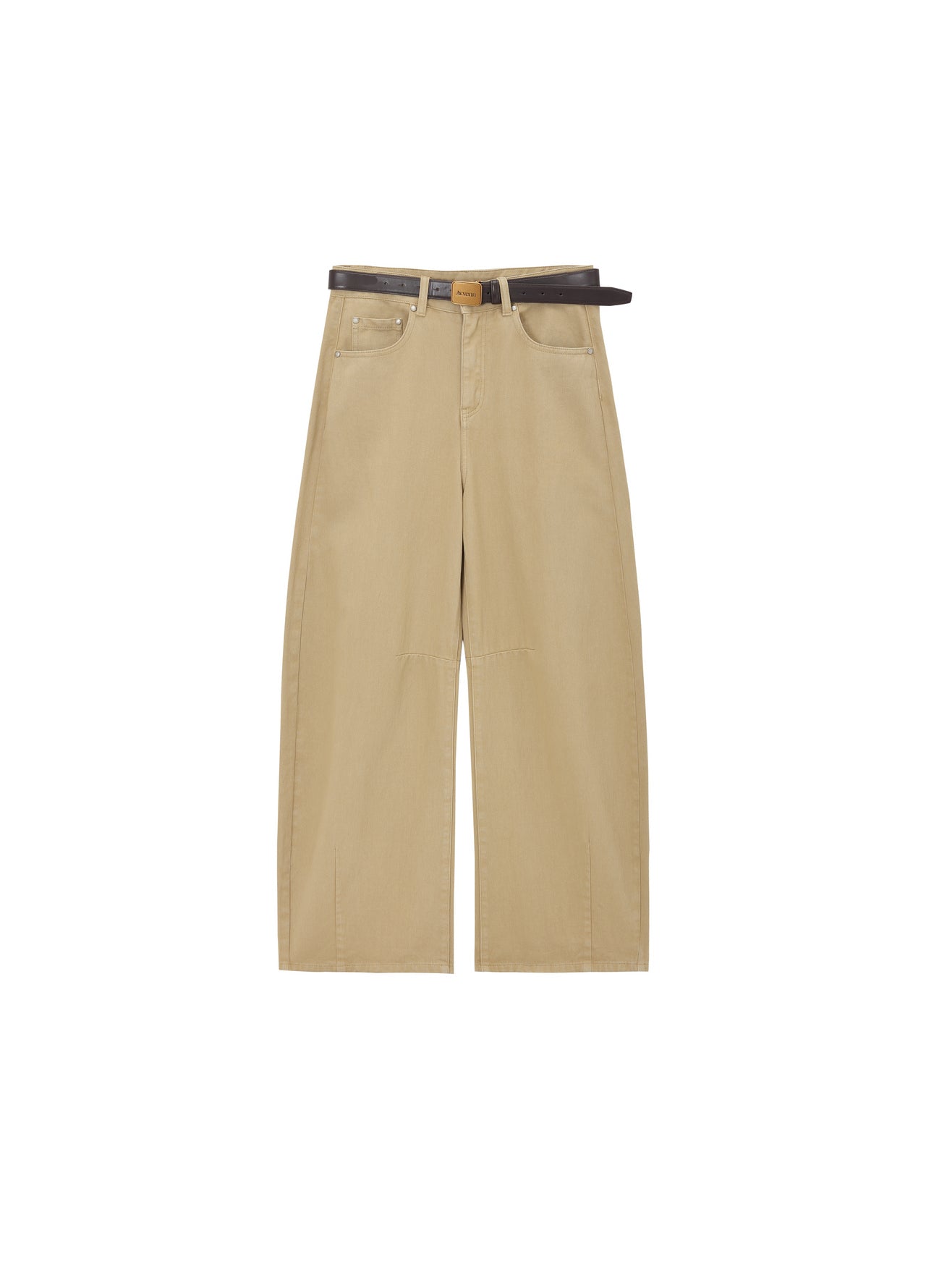 Relaxed tapered silhouette; 100% cotton fabric in Asurate-washed vintage khaki; antique silver shank buttons and rivets; 3D patch pockets at the back; comes with a brown leather belt featuring a gold buckle.