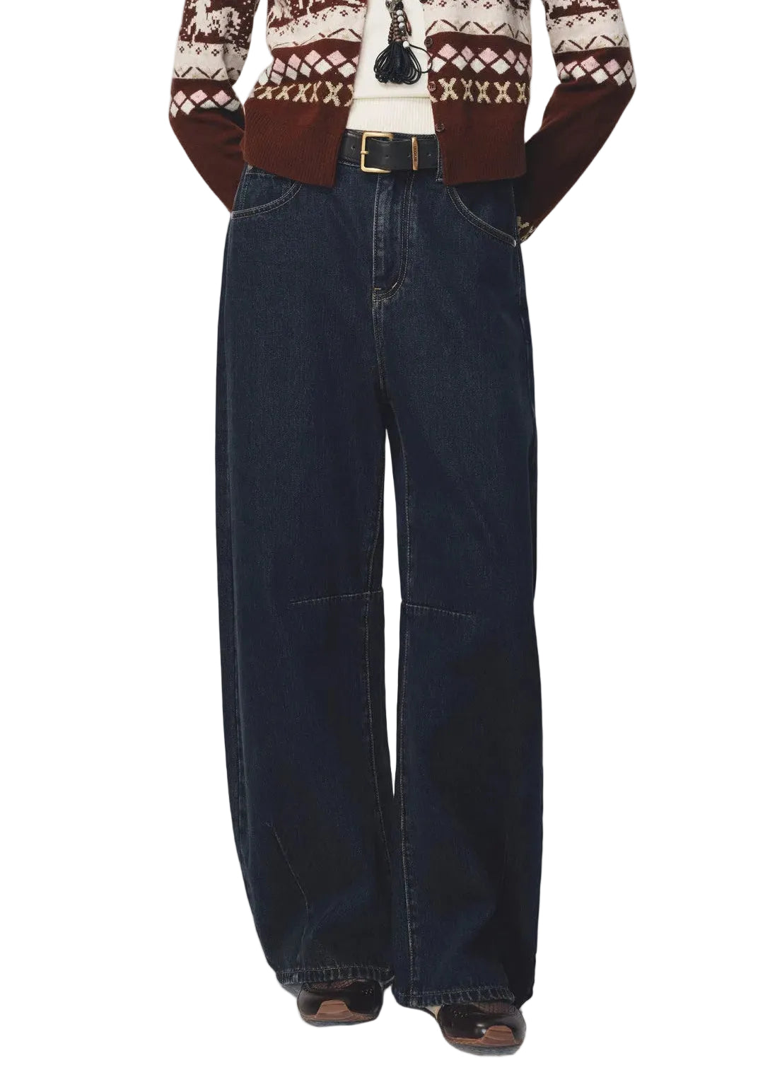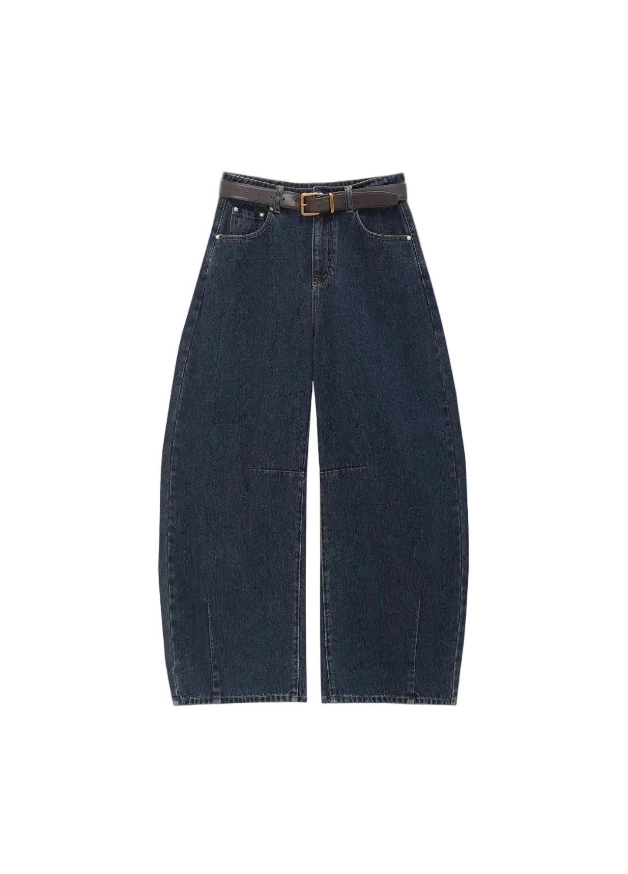 Best selling denim jeans made from vintage washed dark blue denim with high body tolerance featuring knee and leg darts to create a waist slimming and leg lengthening effect sculpted back pockets and a gold logo buckle paired with a dark brown leather belt for a premium finish