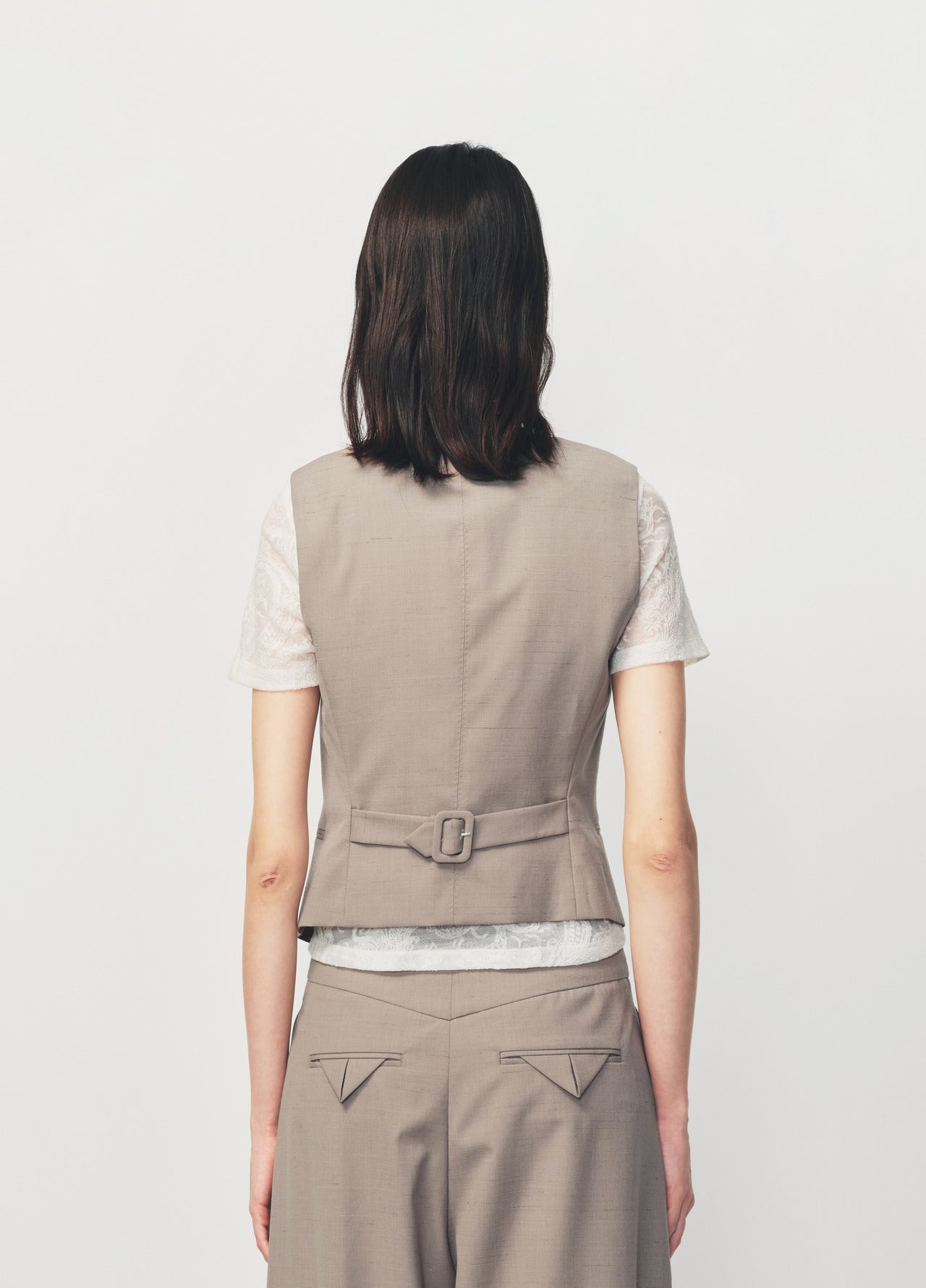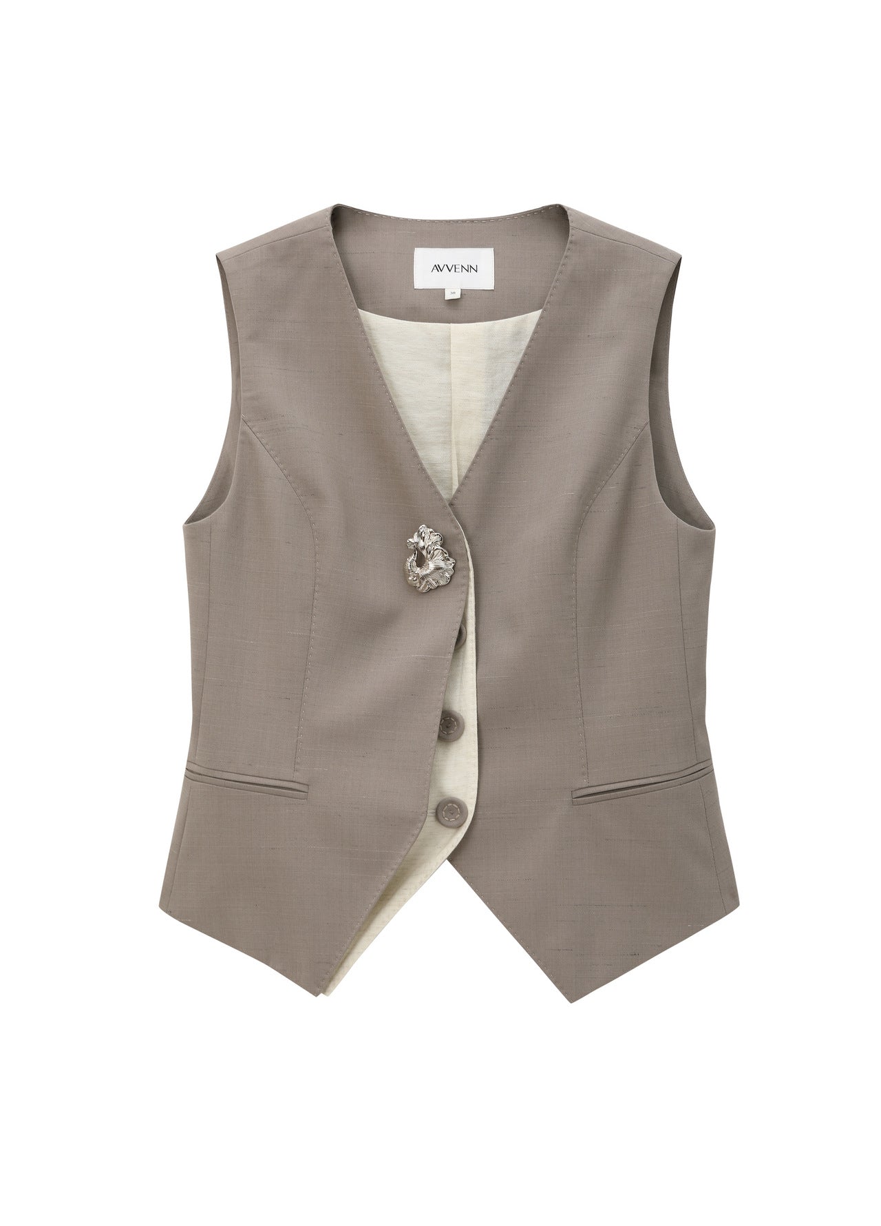 Woven tailored vest with a fitted silhouette crafted from imitation fabric with bamboo slub texture featuring faux layered design contrast placket detailing princess seam construction welt pockets hand stitched arched seam at back neckline and metal hand sewn button accents designed to pair with matching bottoms