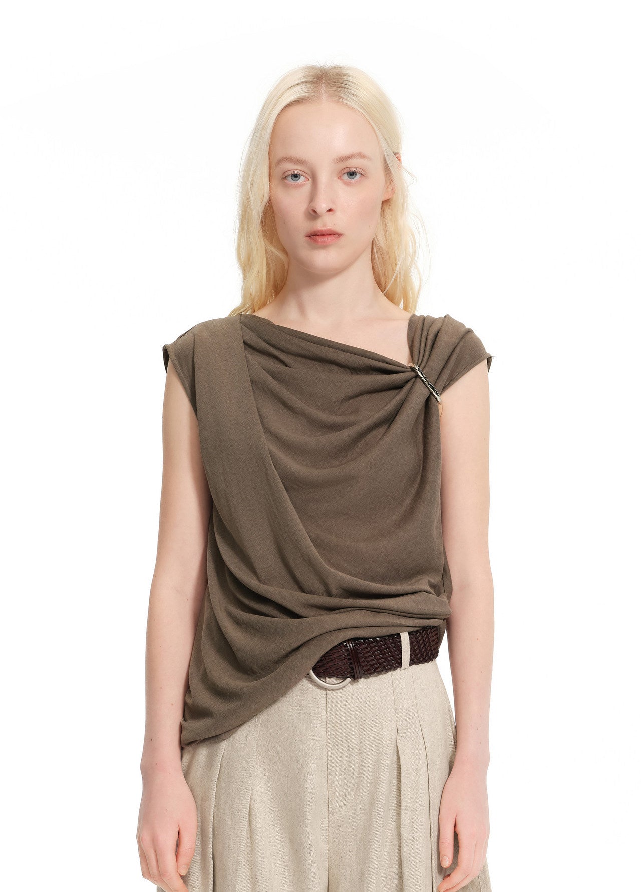 Draped sleeveless top in lyocell, linen, and silk blend. Asymmetric neckline with natural folds across the shoulder. Detachable metal ring detail.