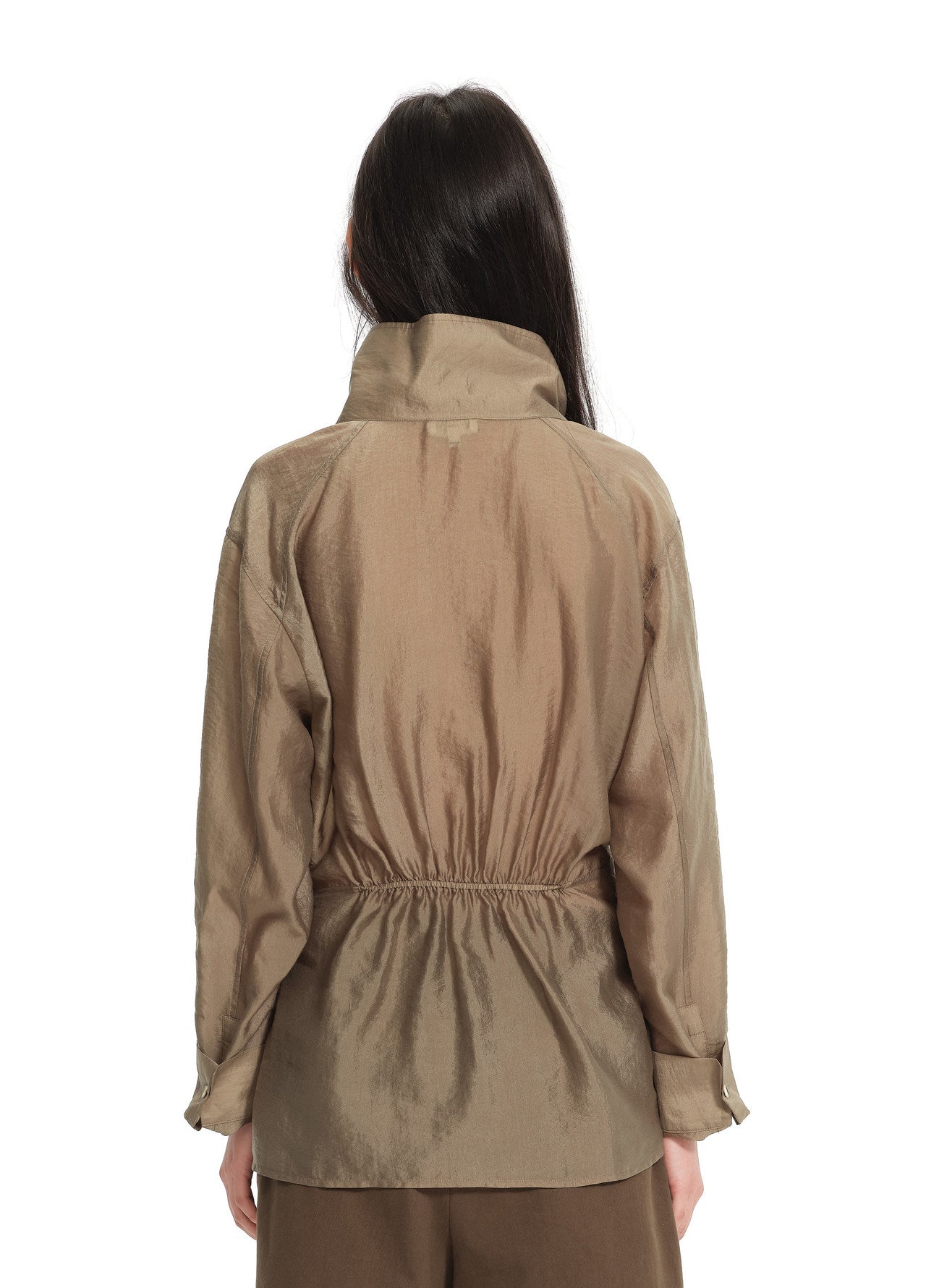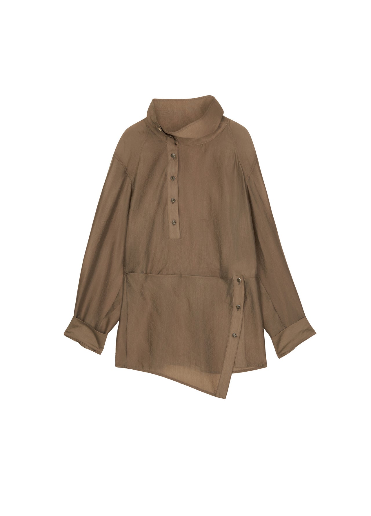 Long shirt / Brown / Copper fiber 85% polyester 15% / Sheer lightweight fabric / Relaxed fit / Asymmetric placket / Convertible collar / Adjustable sleeves / Folded hem panel