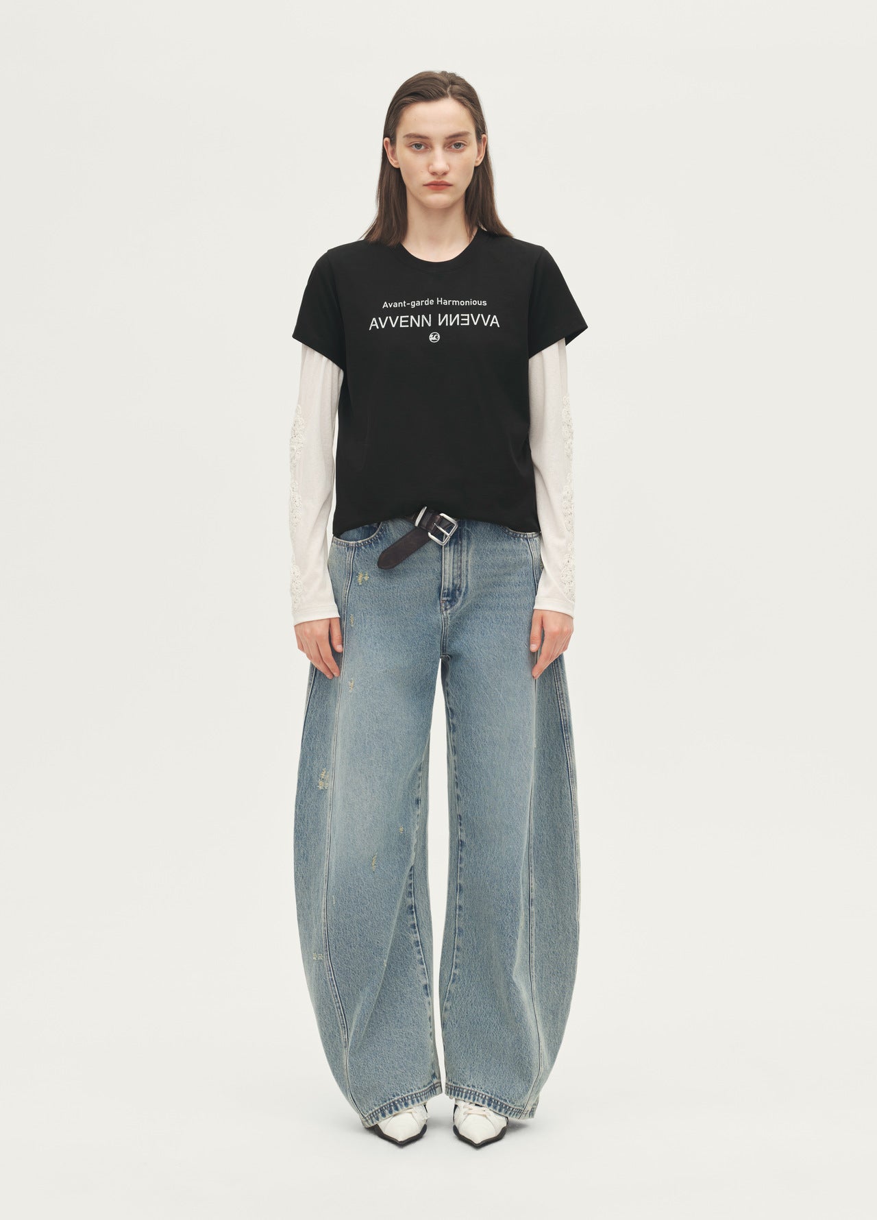 Two-piece dress set featuring a slim dark-grey rib knit cami dress with a racerback silhouette layered with a loose asymmetric-shoulder Tencel tee in semi-sheer fabric with placed artist print and gradient spray effect wearable separately or together.