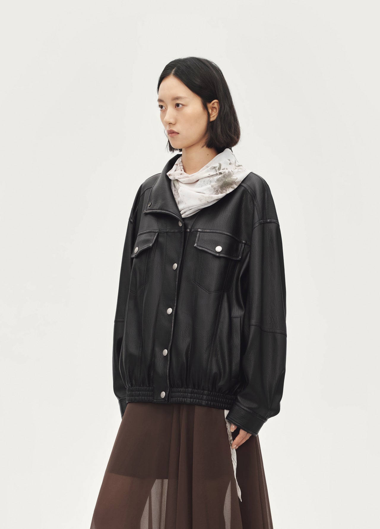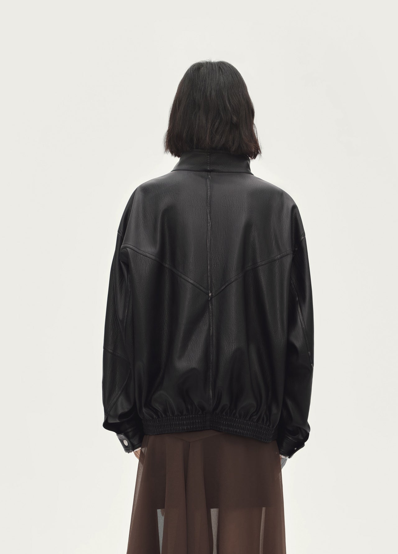 Eco-friendly faux leather jacket / unlike ordinary leather jackets, this one is made with a small stand collar and elastic hem design, giving a cooler and edgier look / aluminum wire added to collar and placket for easy shaping / hand-rubbed fading along seam lines enhances premium texture and sophisticated feel