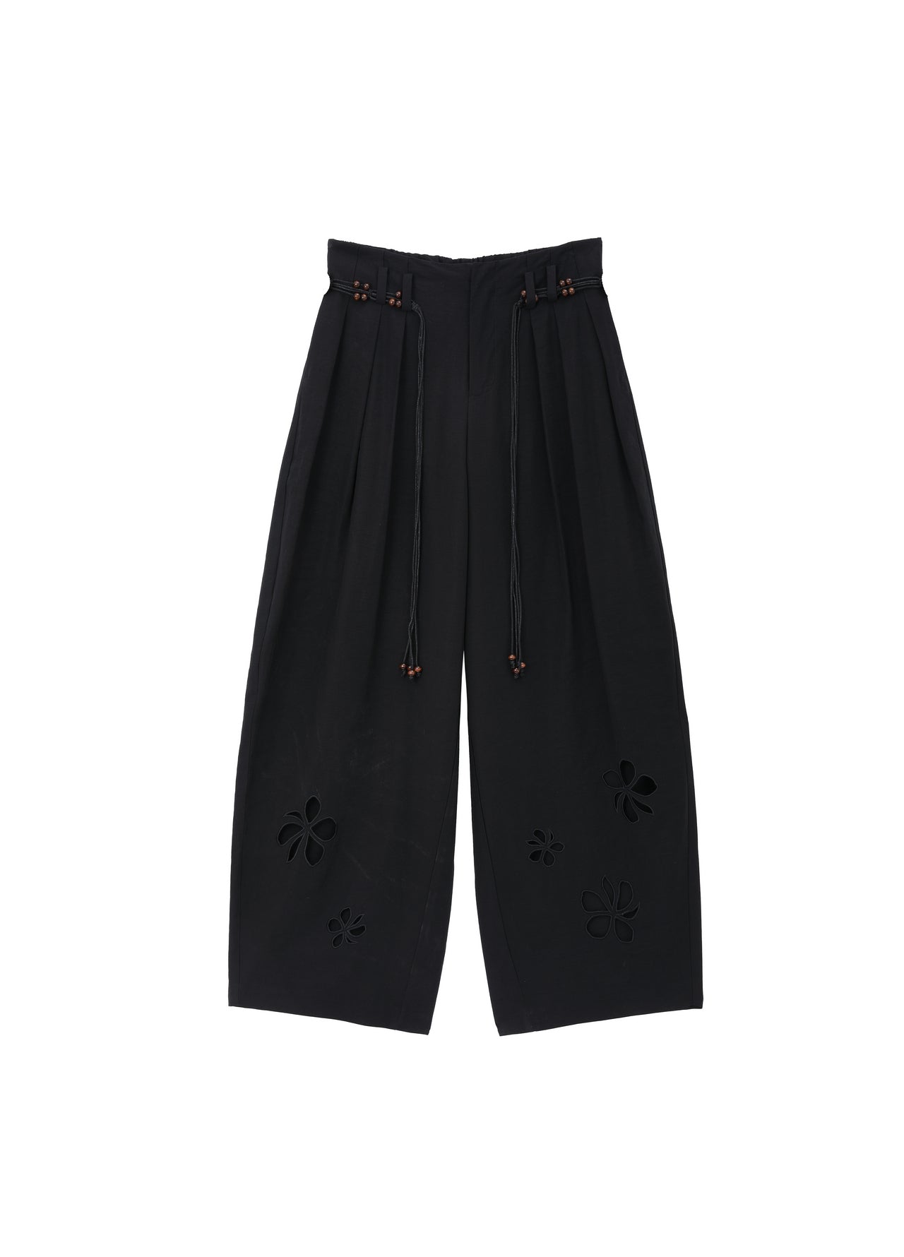 Loose lantern-leg pants in 90% rayon with pleated waistband construction, front simplified floral cutout embroidery from the artist’s work, elasticated back waist, and an included beaded waist chain, suitable for pairing with the capsule bandeau and camis.