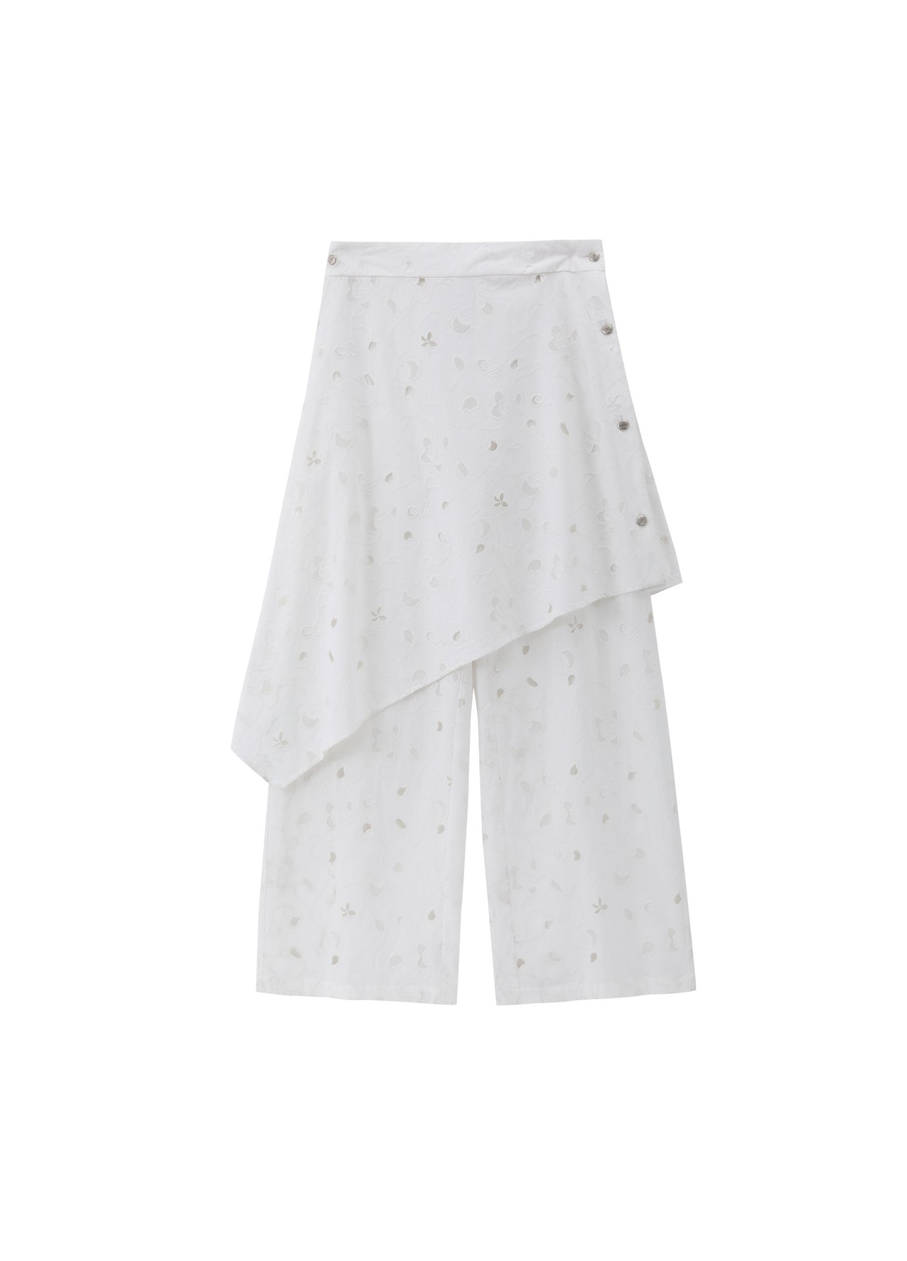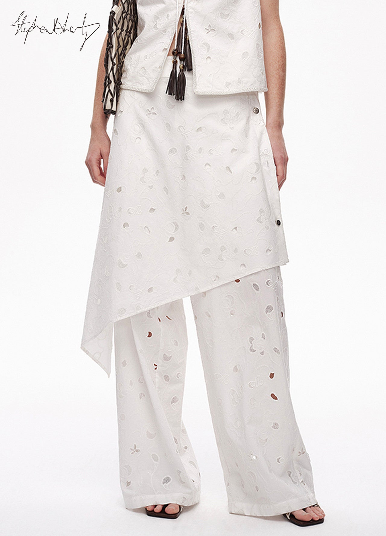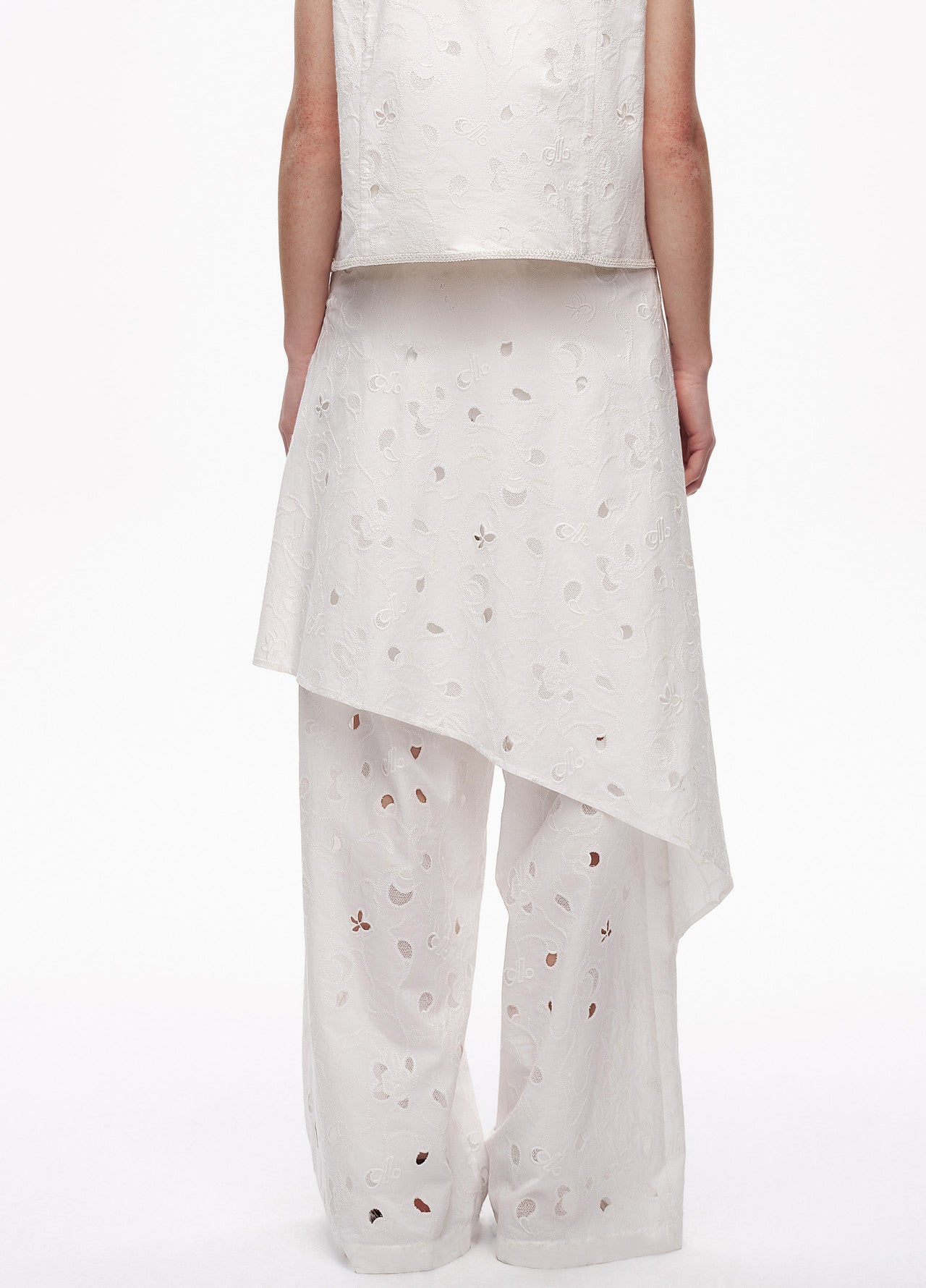 White shirting cutwork embroidery combining the artist’s florals with the brand logo featuring layered stitch techniques and a detachable self-fabric peplum panel with hand-sewn metal buttons suitable for pairing with the coordinating vest.