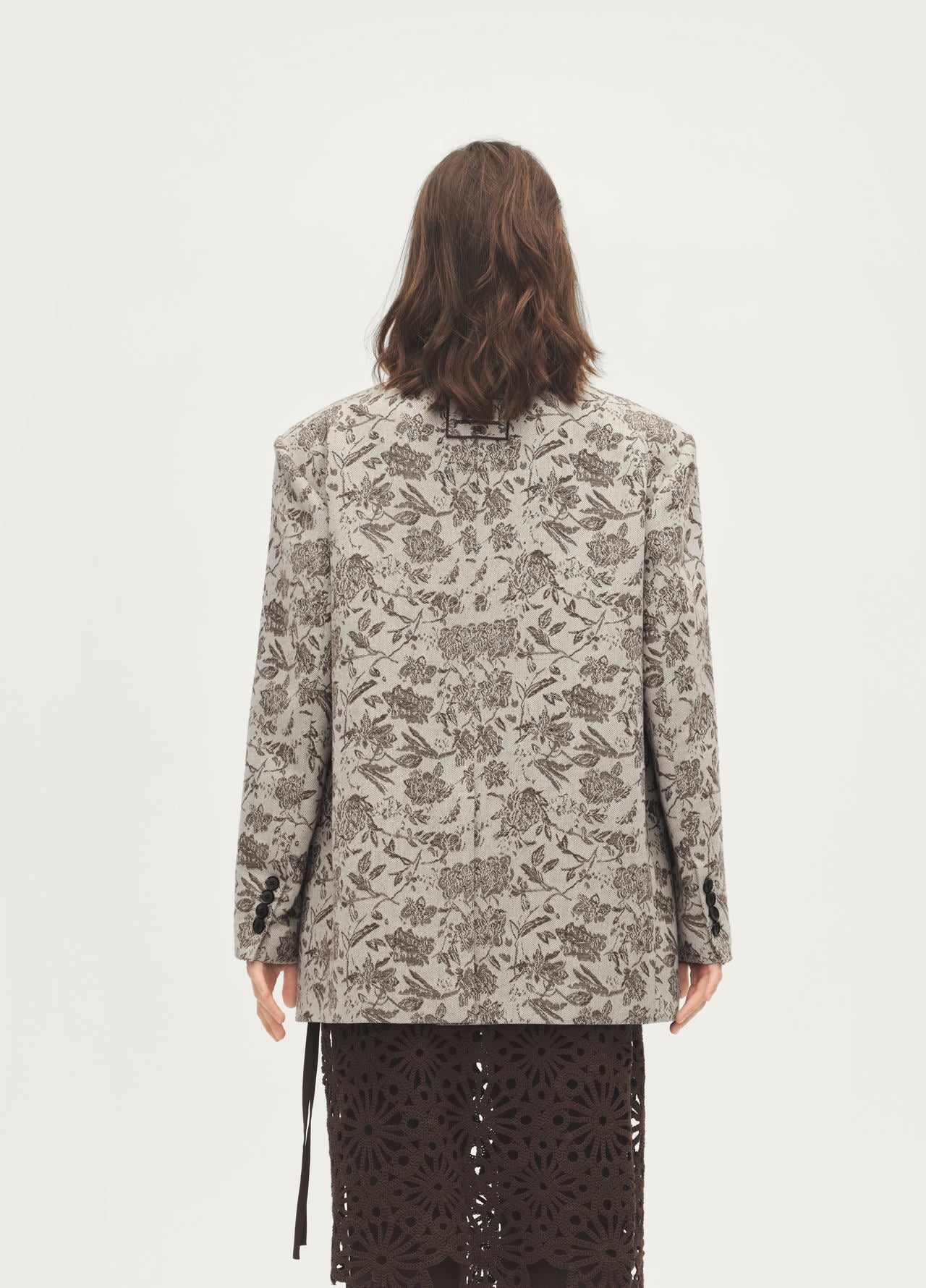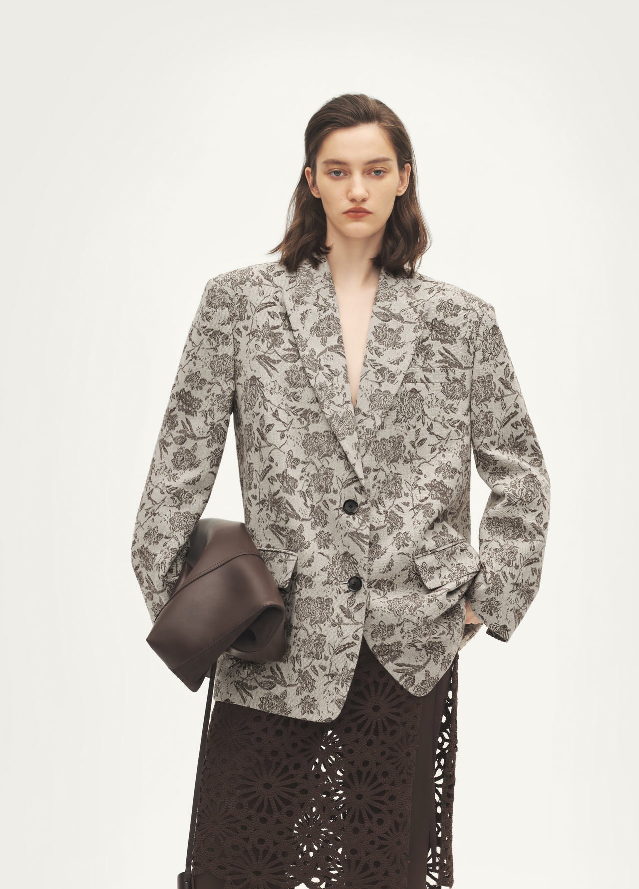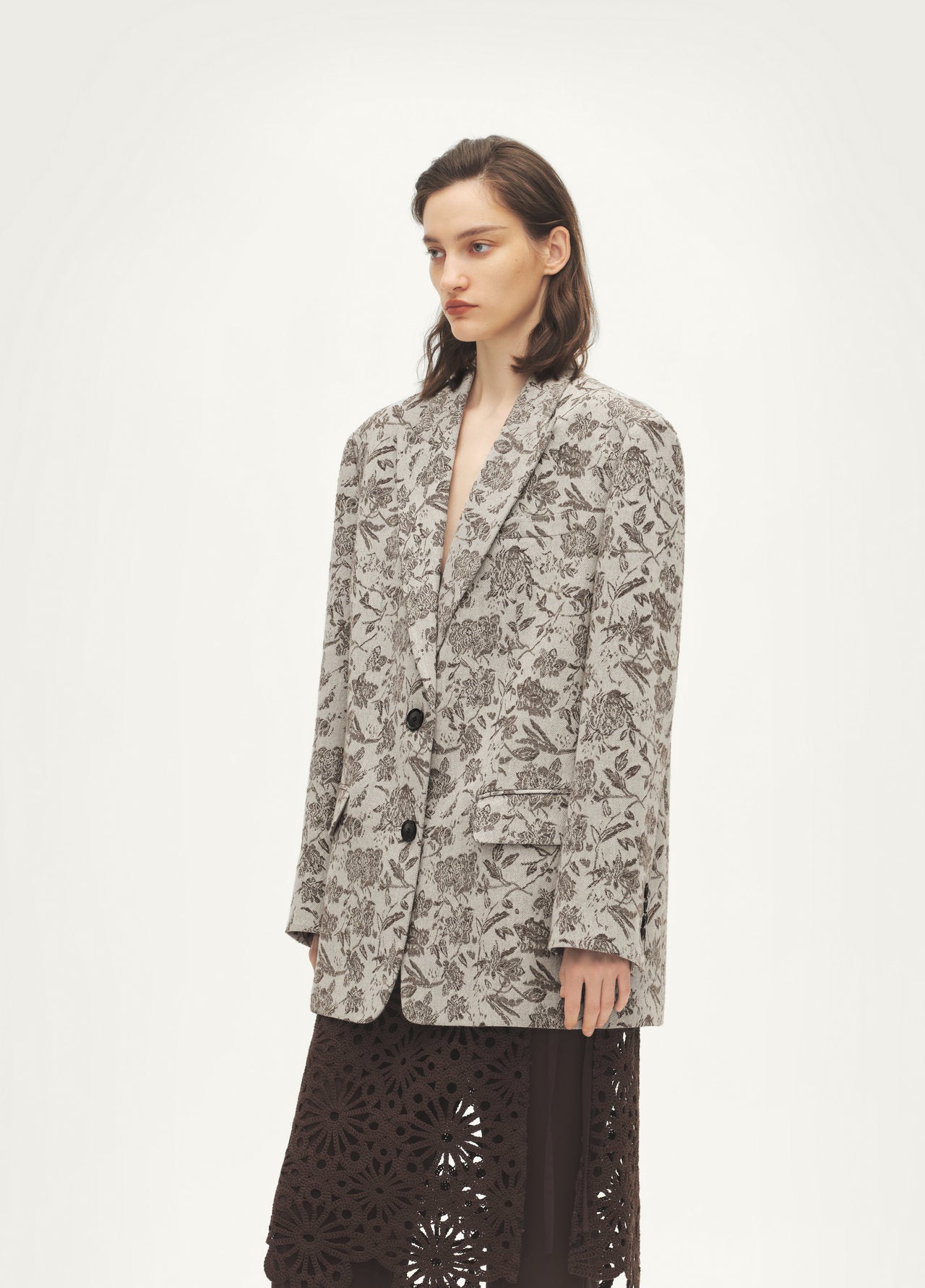 Cotton-linen jacquard blend with natural antibacterial, wrinkle-resistant qualities; sharp tailored blazer silhouette with classic notch lapel; modern and refined.