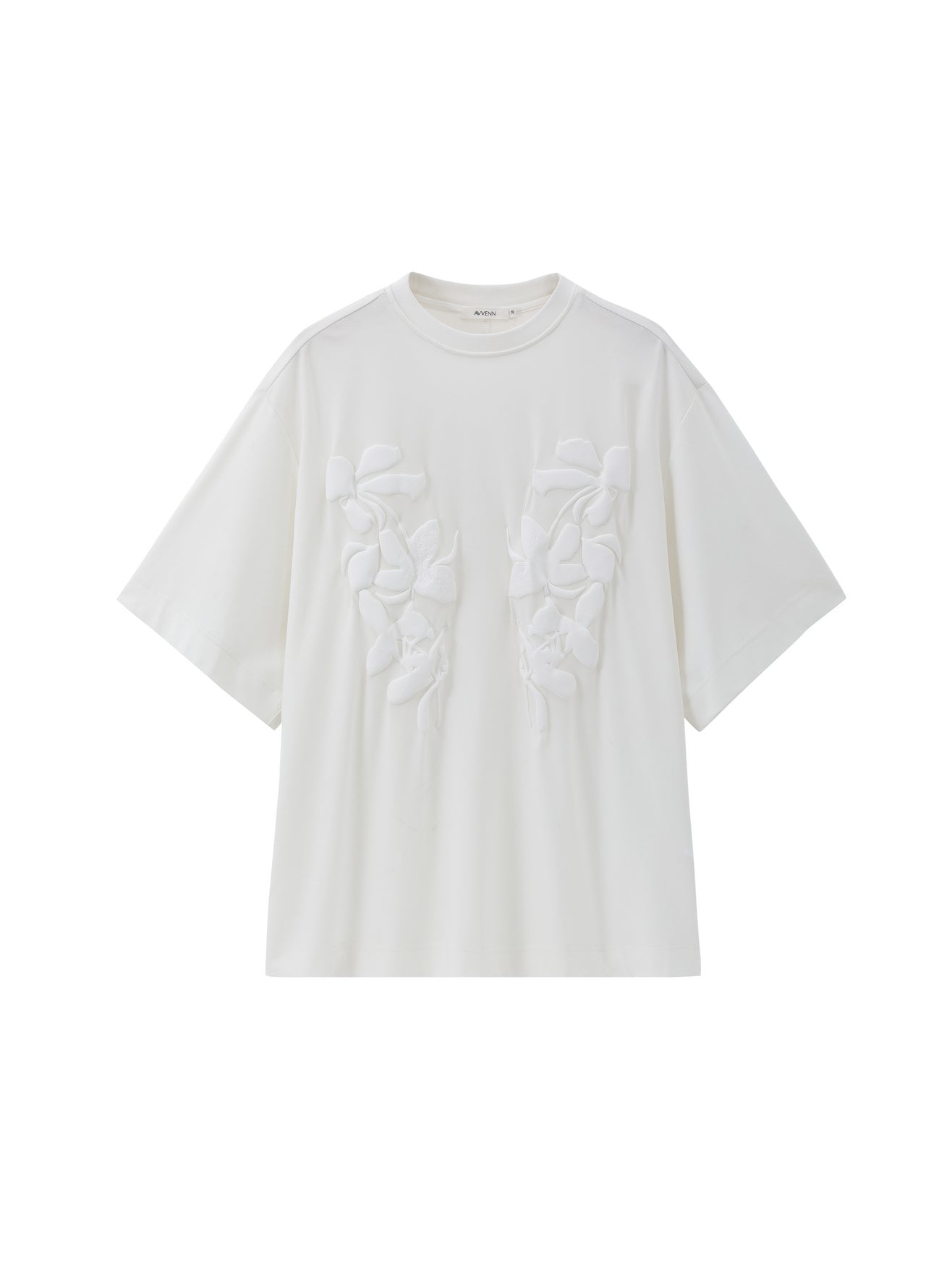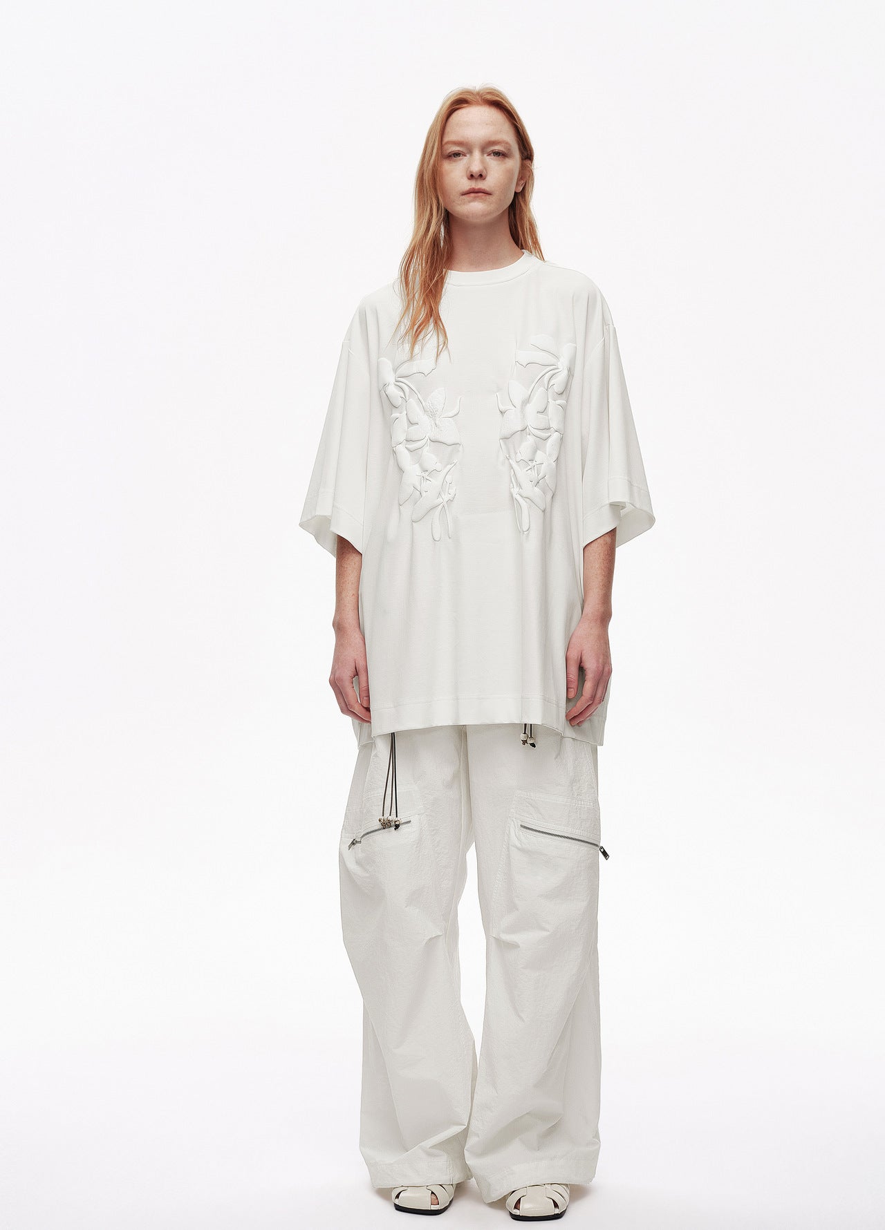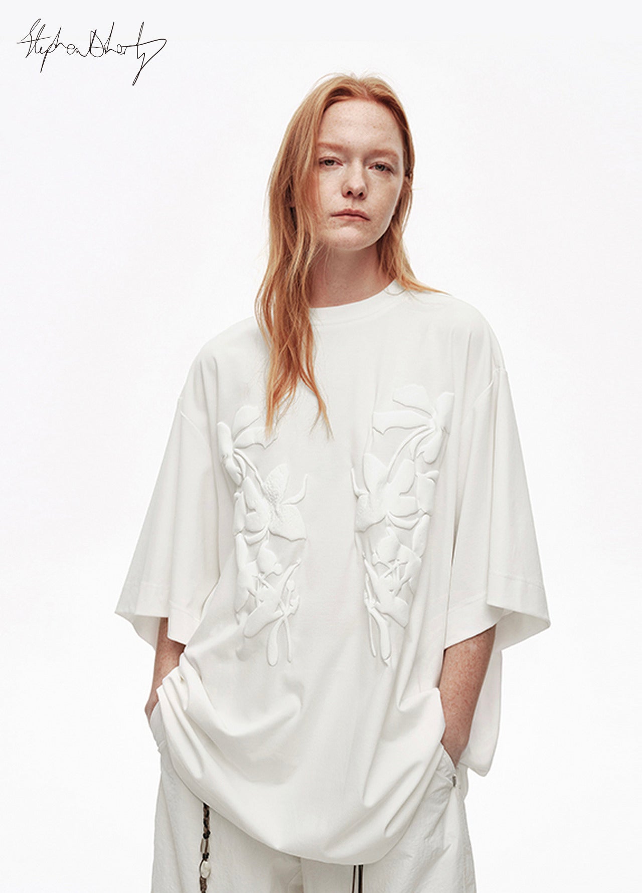 T-shirt dress in an oversized dropped-shoulder silhouette made from premium American Pima cotton with high-count high-twist yarn for a fine dry handfeel, featuring an artist’s white floral foam print on the front, a rolled-edge rib neckline, a white woven side-seam label, and a design that can be worn alone or paired with trousers.