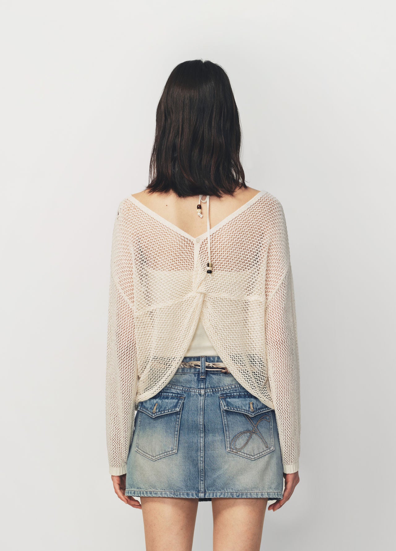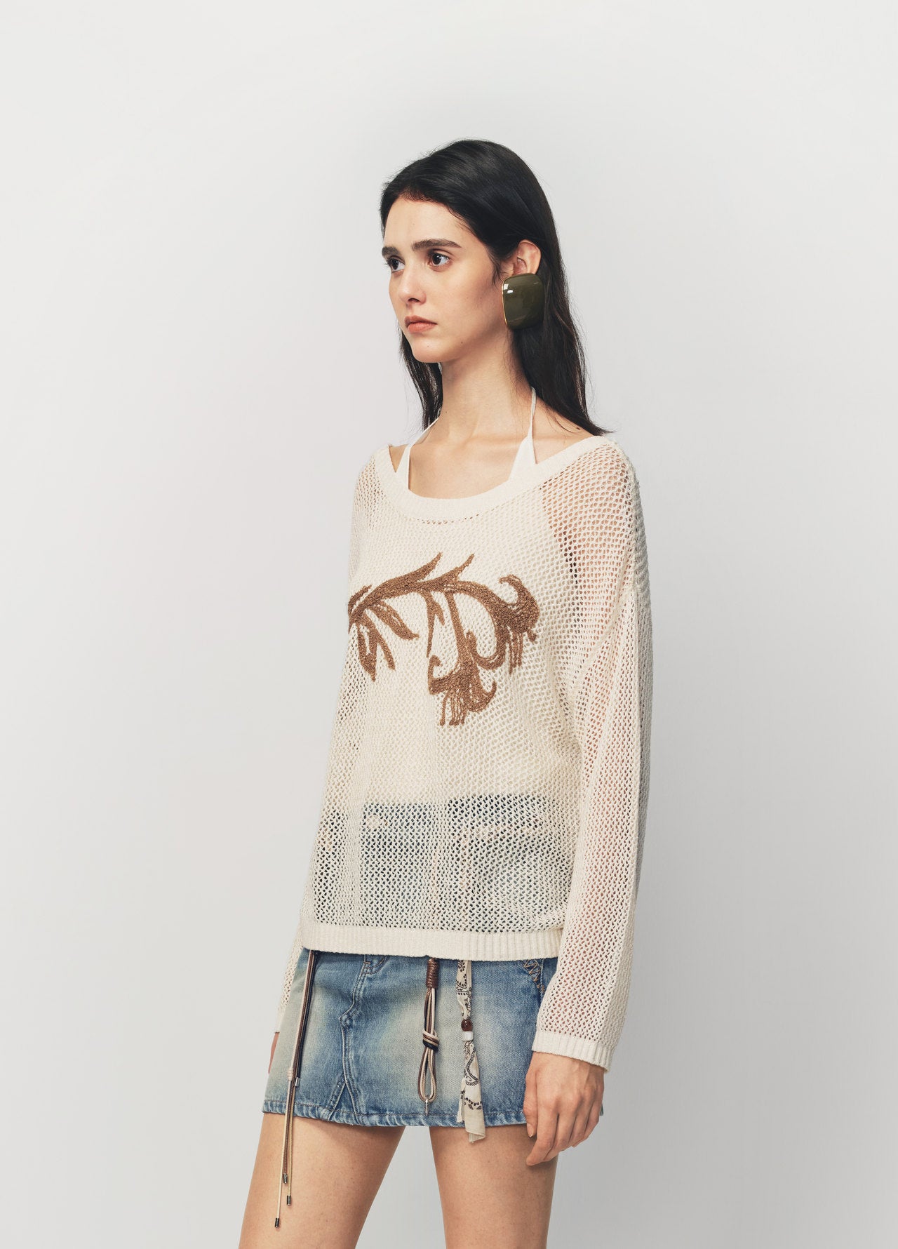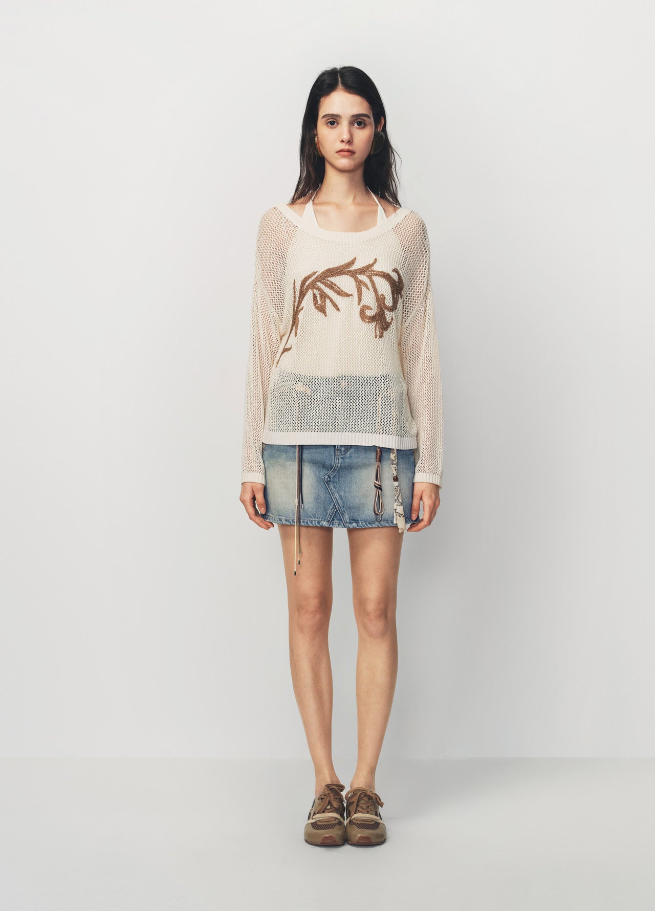 Long sleeve knit sweater featuring a relaxed silhouette textured yarn true layered construction adjustable beaded vest tie cords special embroidered motif at the chest and designed to pair with cutwork embroidered pants