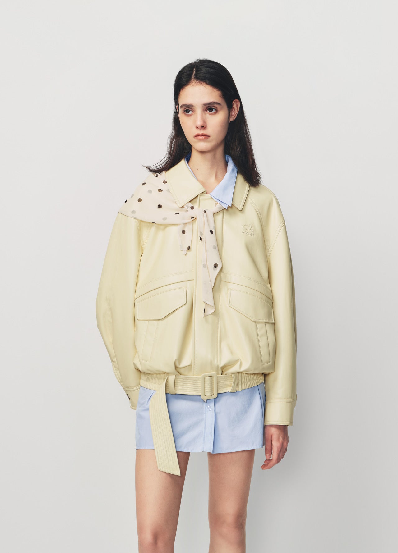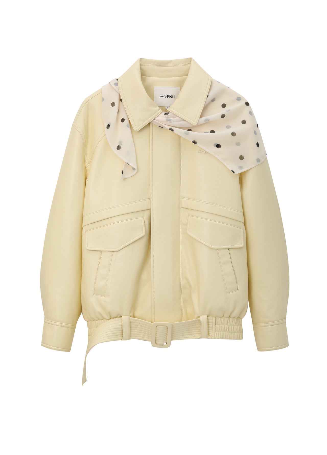 Leather jacket with a relaxed fit featuring paneled front construction straight slanted flap pockets elasticated self fabric hem adjustable cuffs with matte silver logo snap buttons deep pleated structure detachable polka dot scarf and designed to pair with the matching polka dot skirt