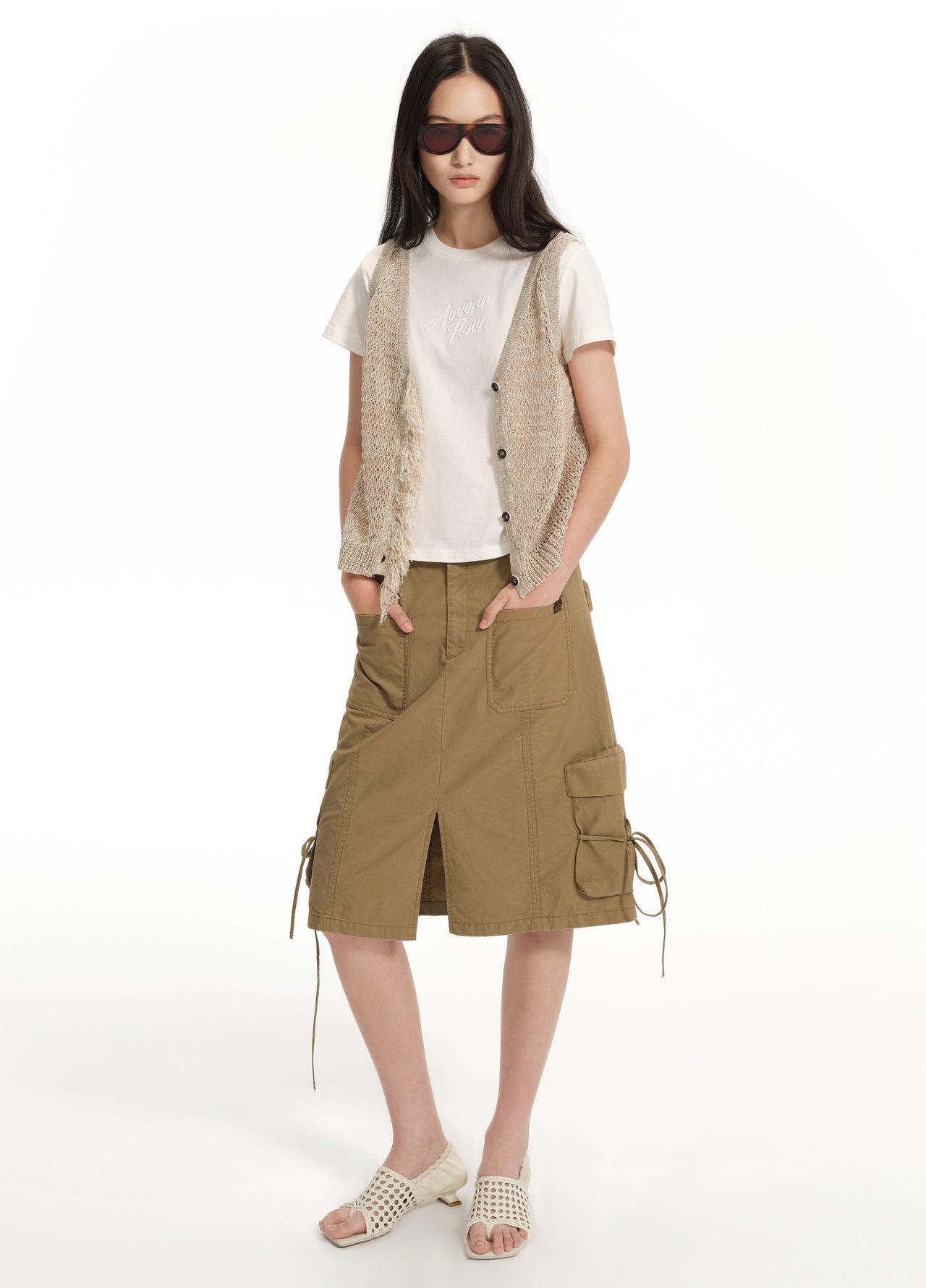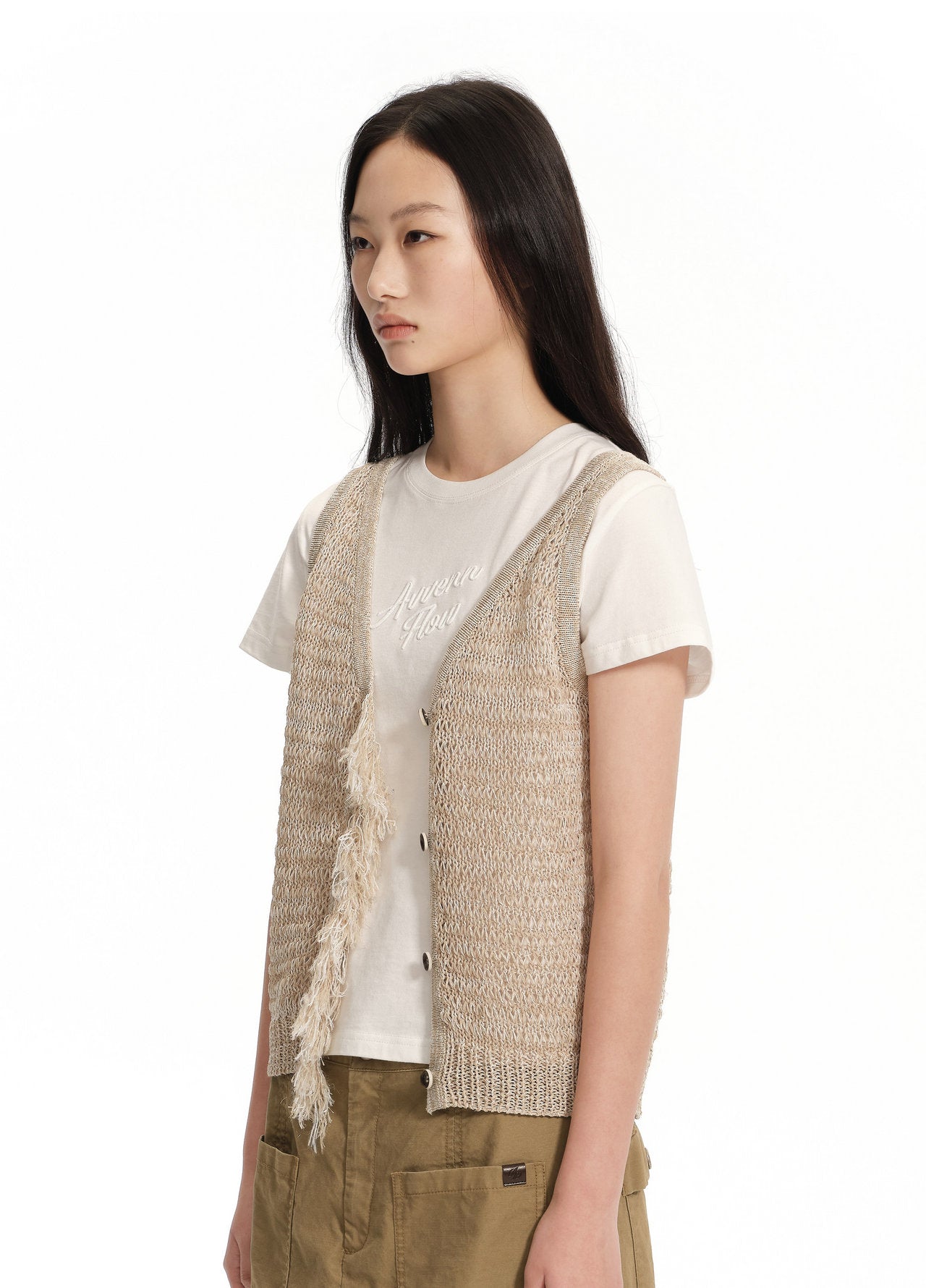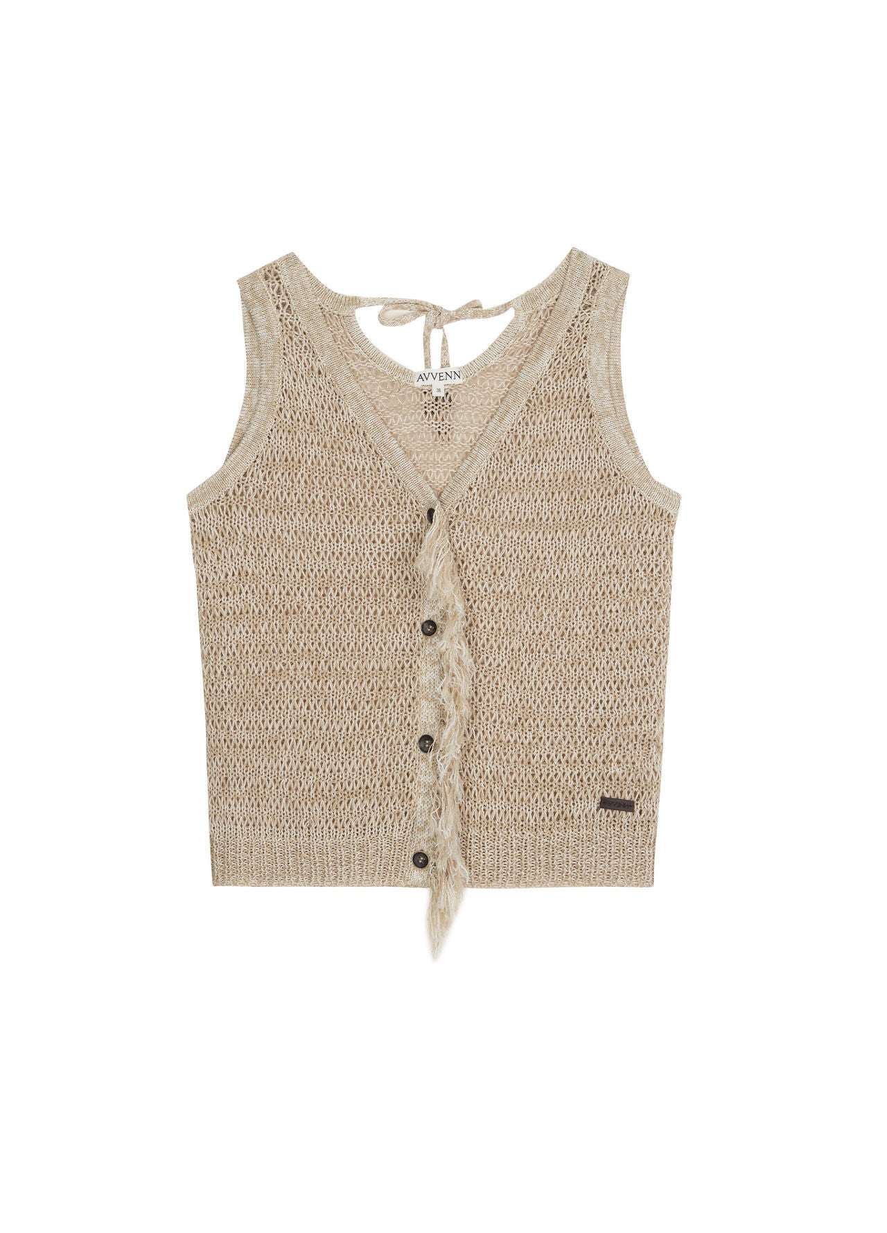 Knit vest / Off-white / Washi yarn blend / Burnt-edge buttons / Logo leather patch / Fringe placket / Back tie with beads