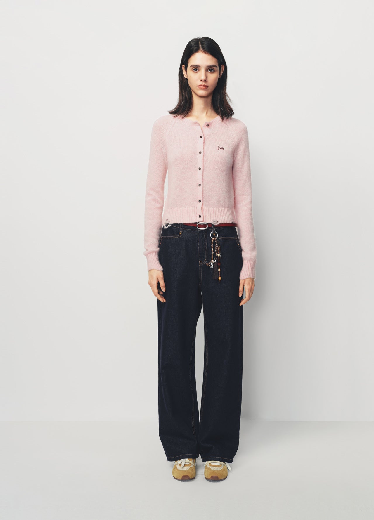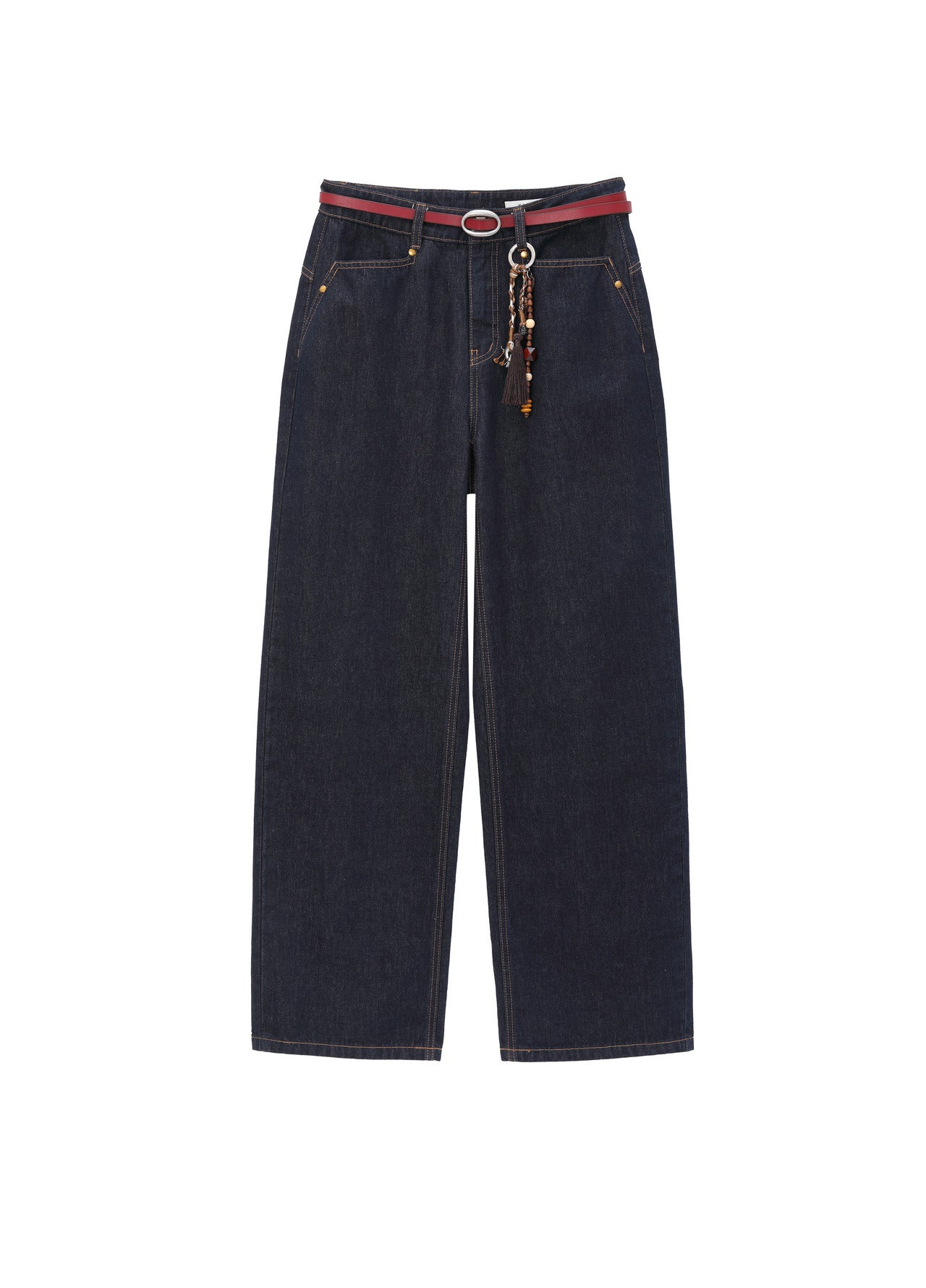 Dark Blue Little Bamboo Horse Belted Wide-Leg Denim Pants
