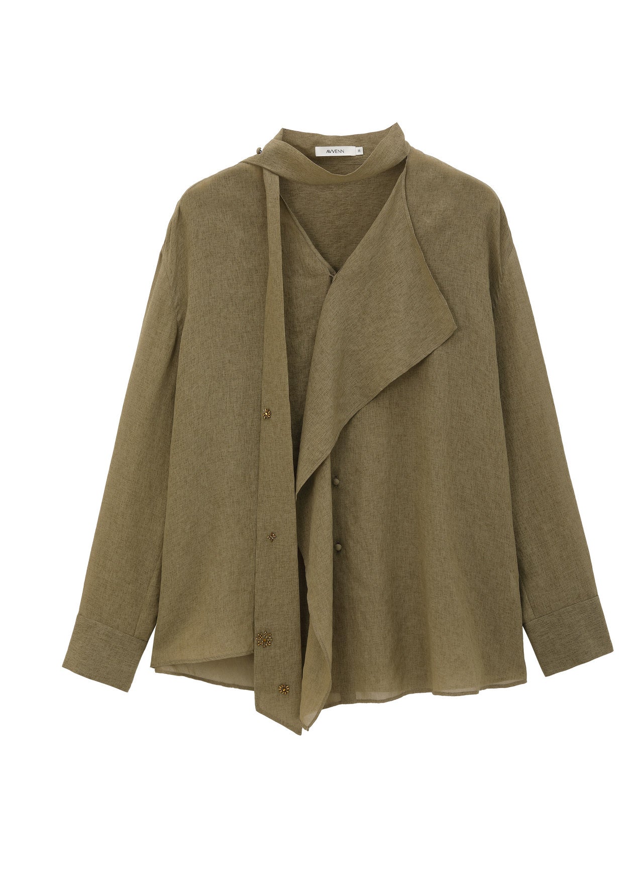 Long shirt crafted from Japanese imported fabric made from 100 percent polyester sheer chiffon in yellow green tone featuring a relaxed silhouette ribbon tie neckline with beaded embellishment and designed to pair with skirts or long skirts