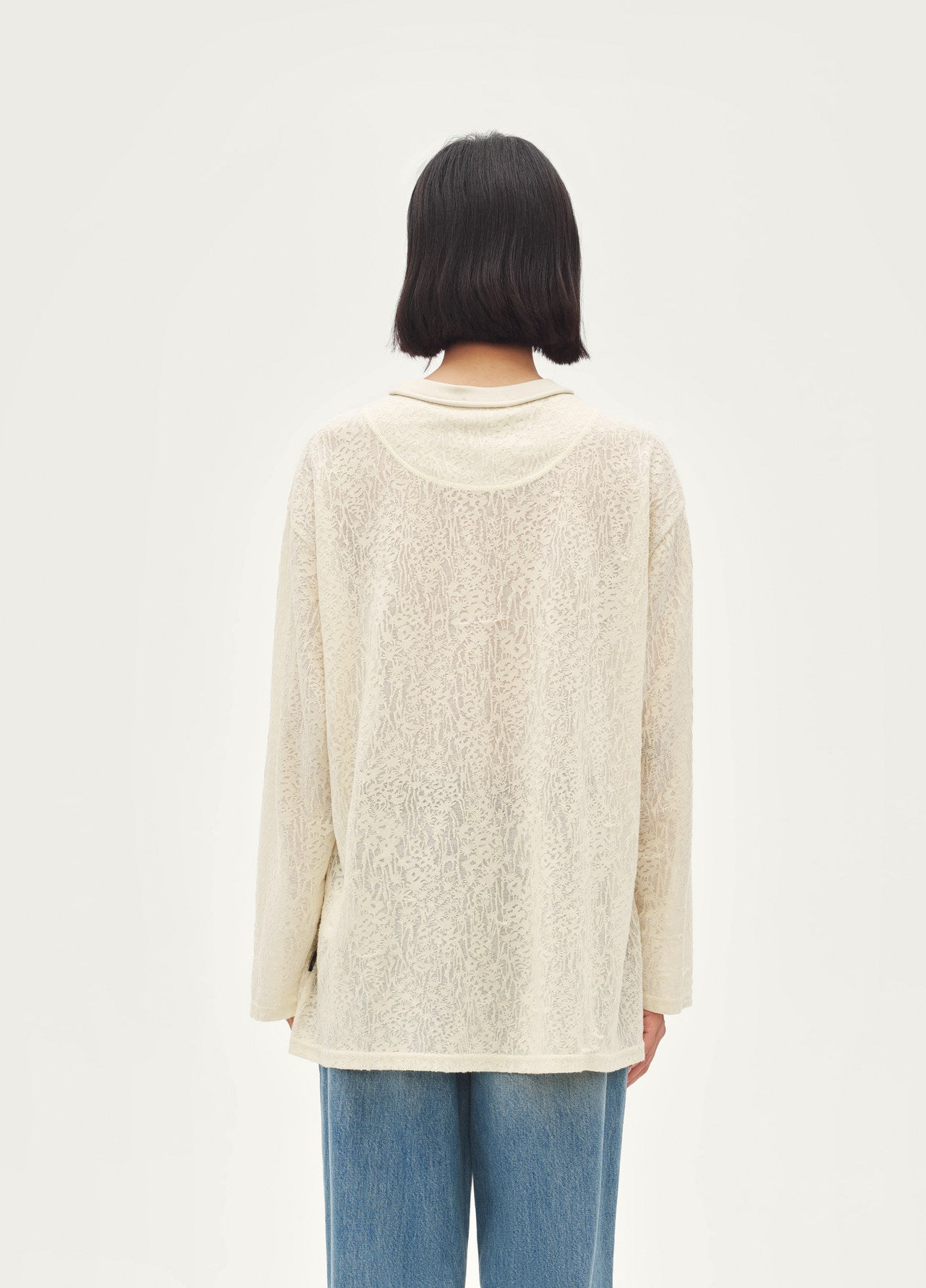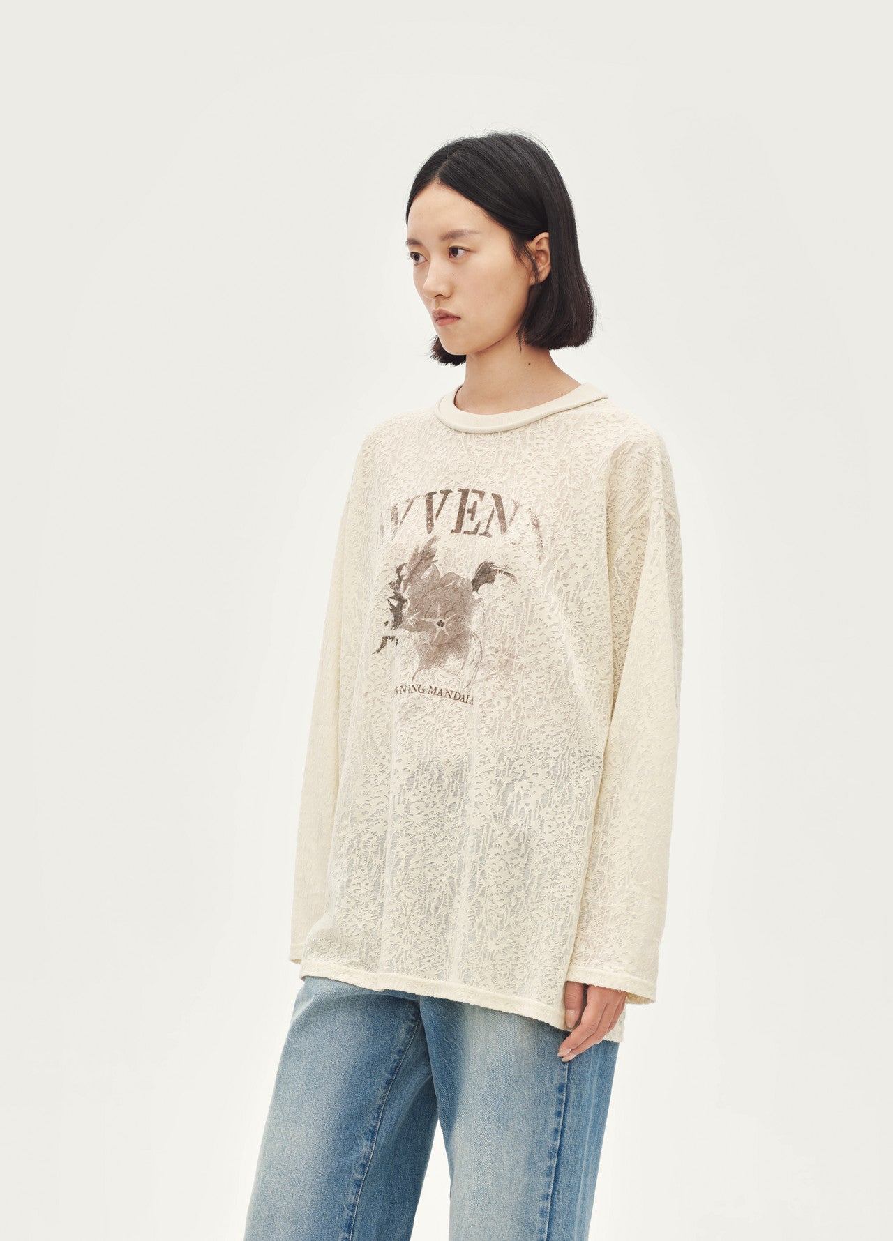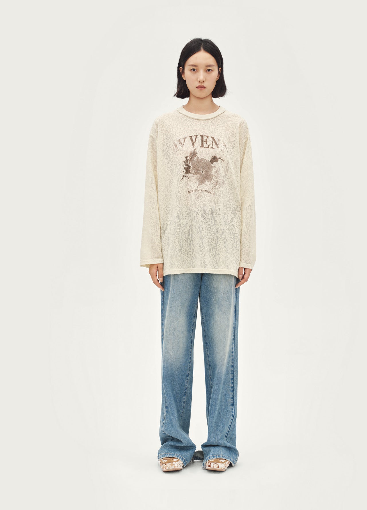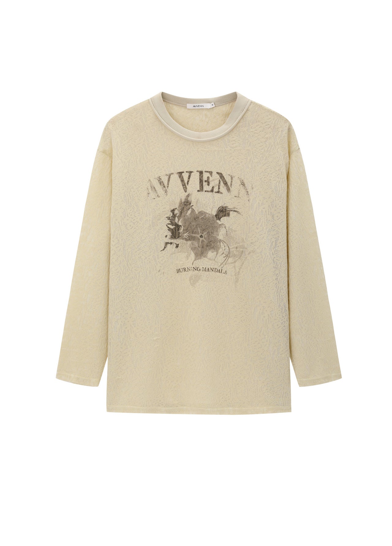 Crewneck T-shirt/cotton-feel jacquard fabric/light grayish yellow/loose straight silhouette/adjustable hem with tonal buttons/rolled ribbed neckline/gray-brown mottled digital print on front/pairs with loose jacket and skirt or relaxed jeans, midi skirt