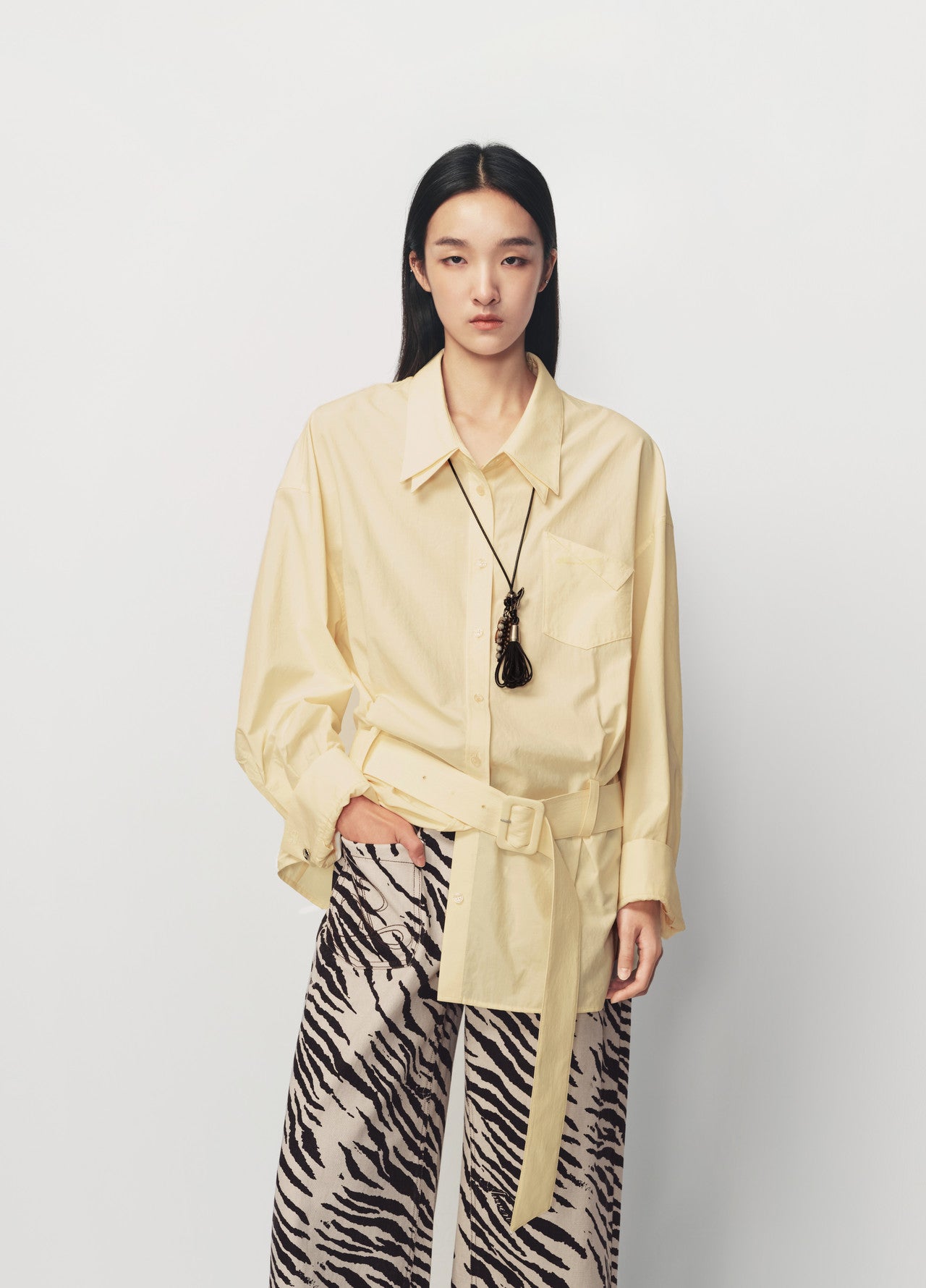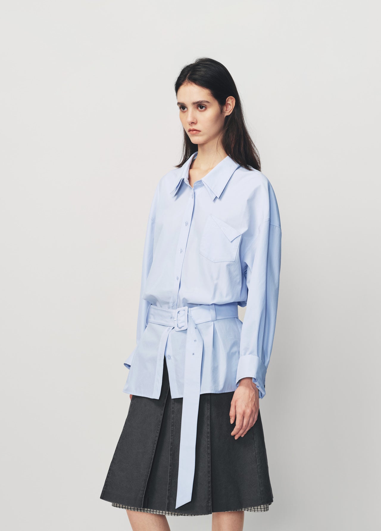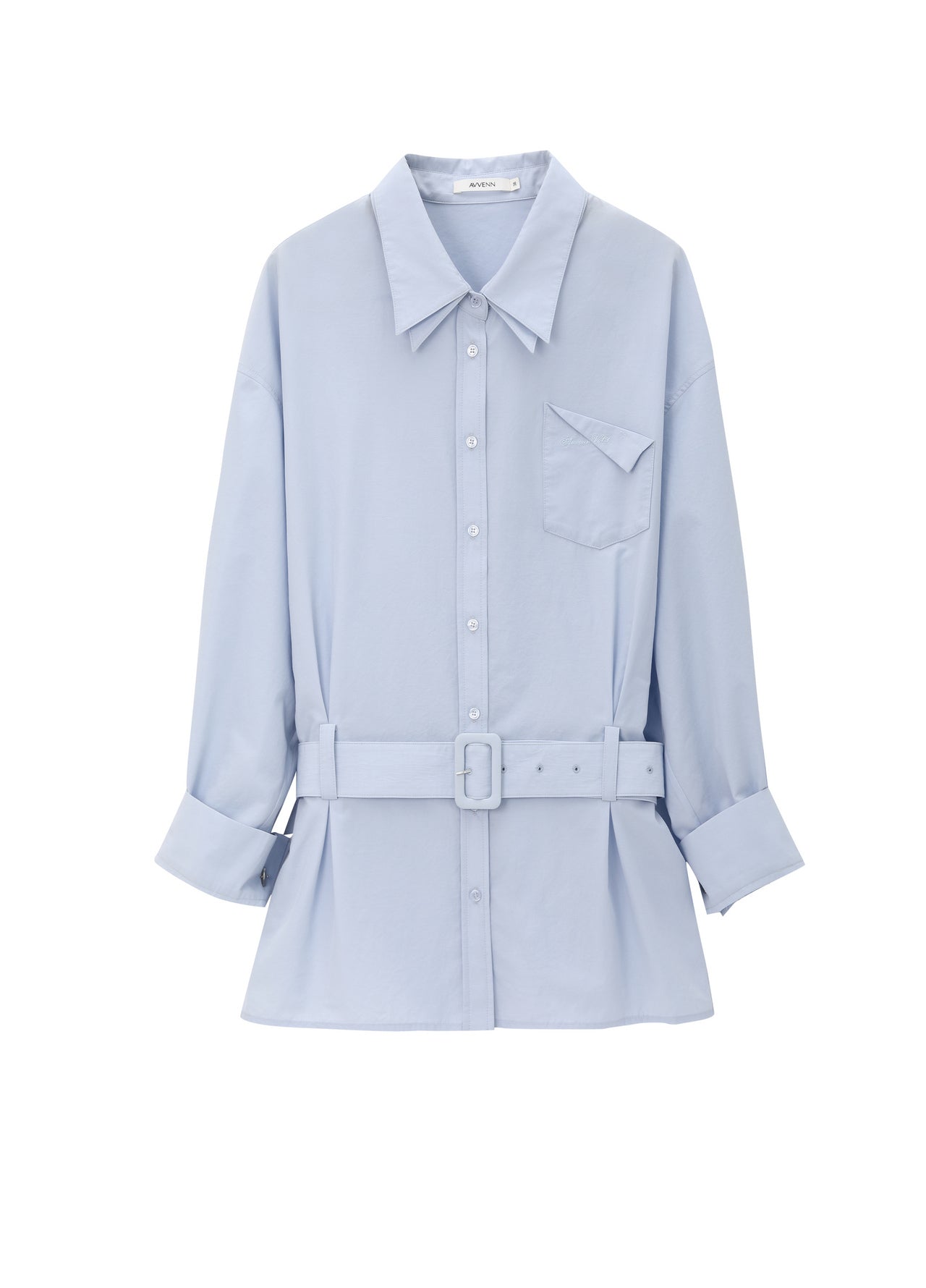 Relaxed fit shirt crafted from cotton nylon fabric featuring a double layer collar design dropped shoulders front patch pocket with folded edge logo embroidery waist shaping with matching fabric belt metal button accents at the cuffs and designed to pair with any pants