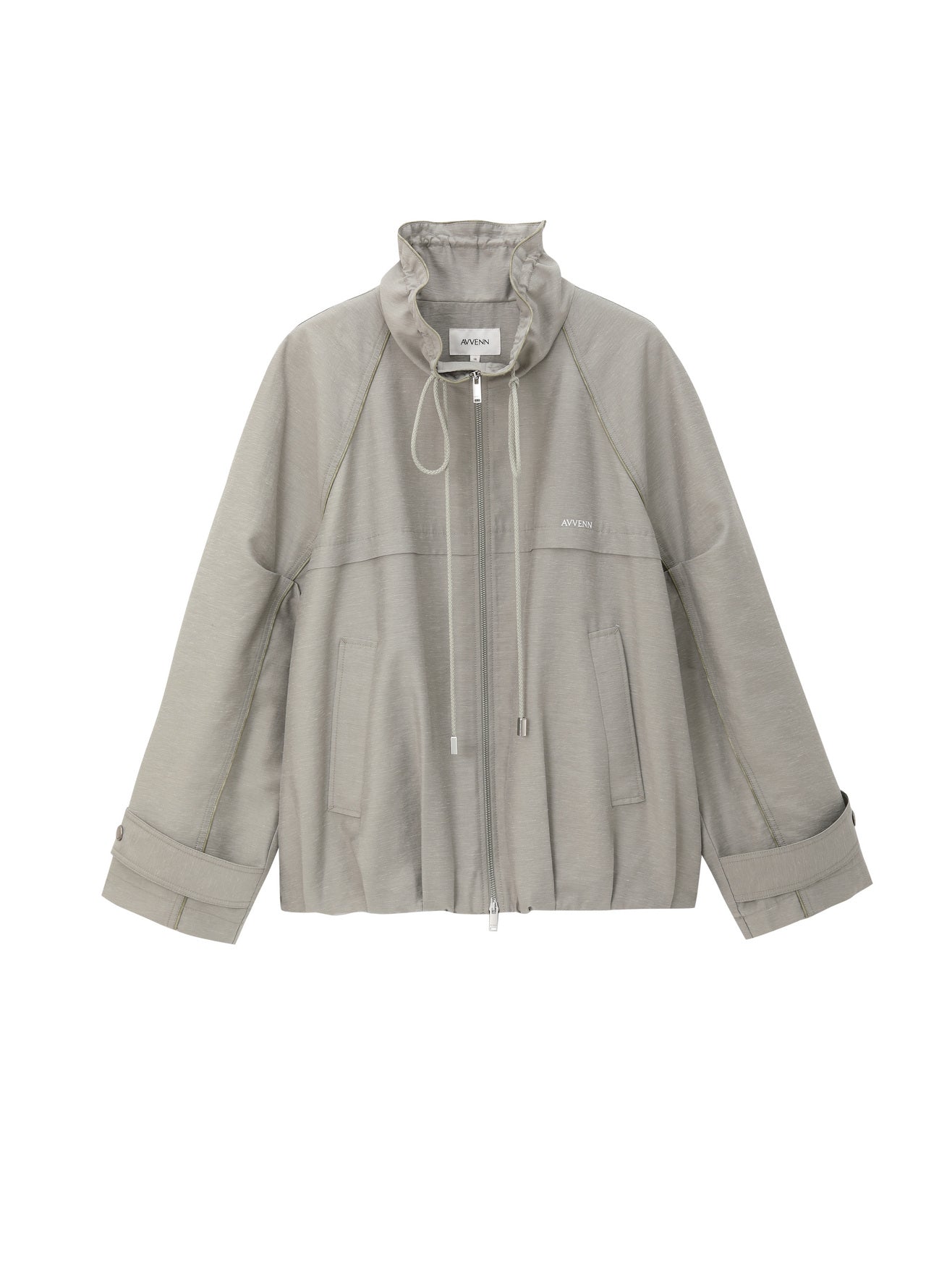 Spring green sporty jacket crafted from linen blend fancy yarn bamboo slub textured fabric featuring dyed gradient piping detailing and textured knit collar drawstrings delivering a fashion forward athletic aesthetic