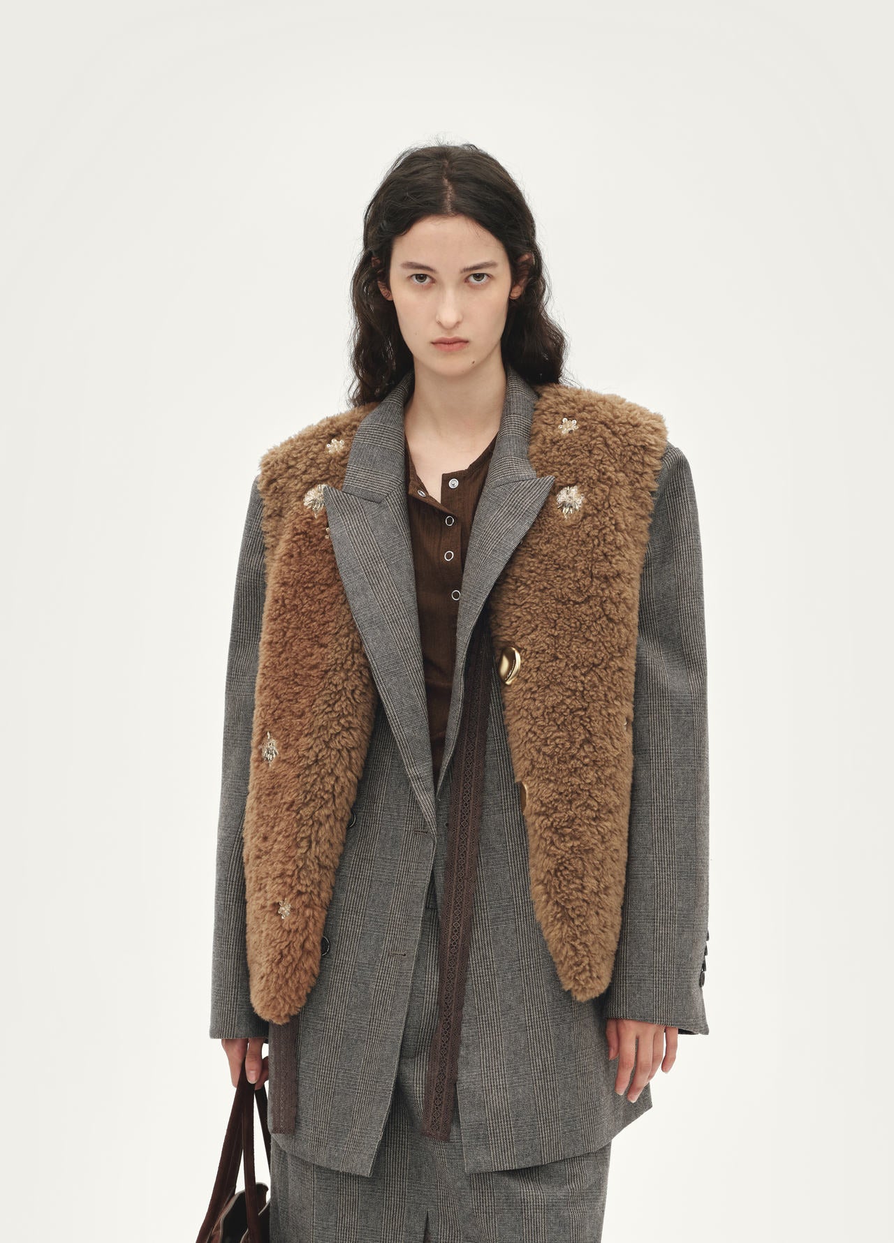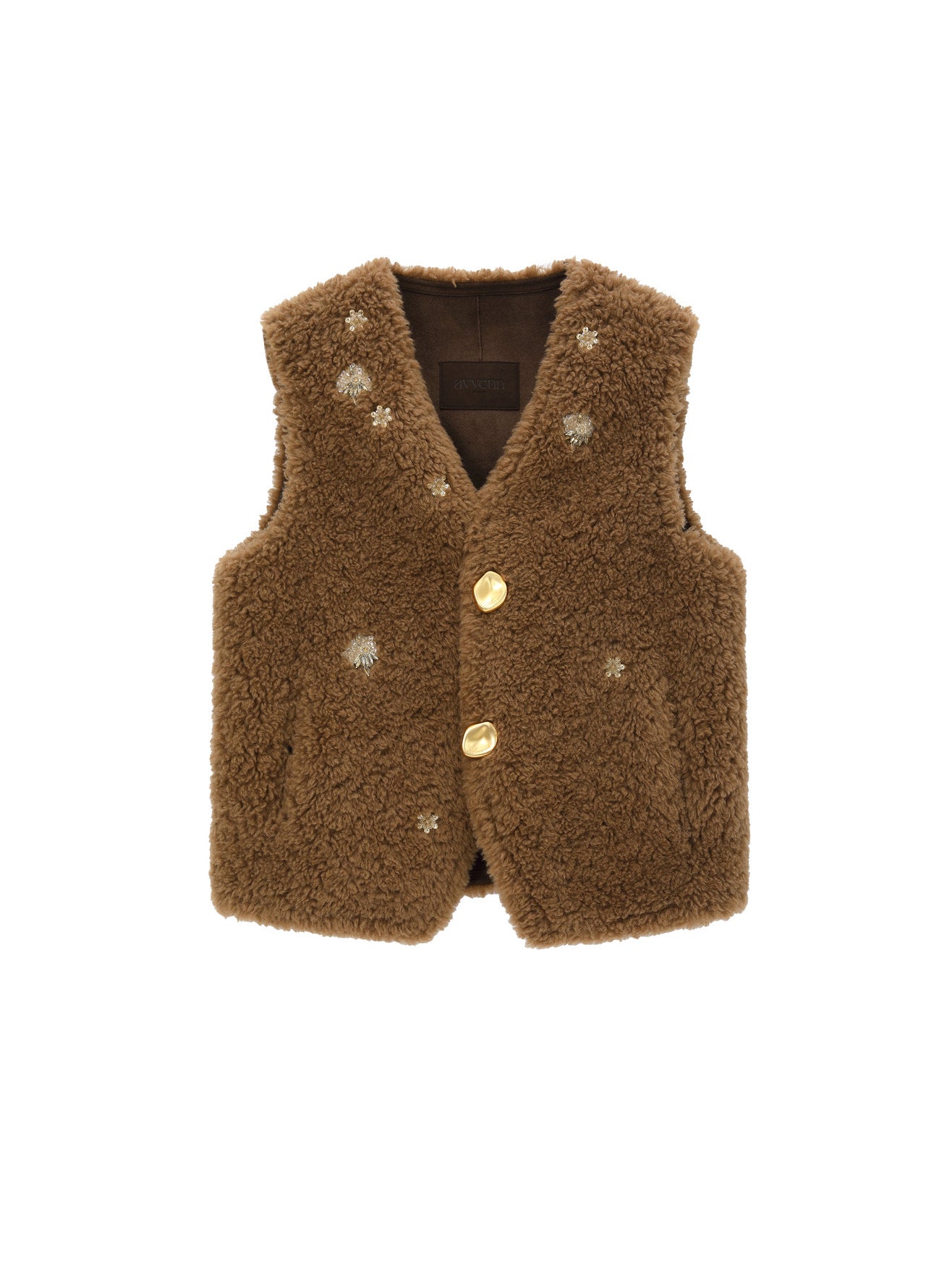 Woven wool vest / reversible / one side 30% wool boucle in brown / other side dark suede / embellished with hand-beaded artist embroidery and button-shaped brooch / versatile, delicate layering piece