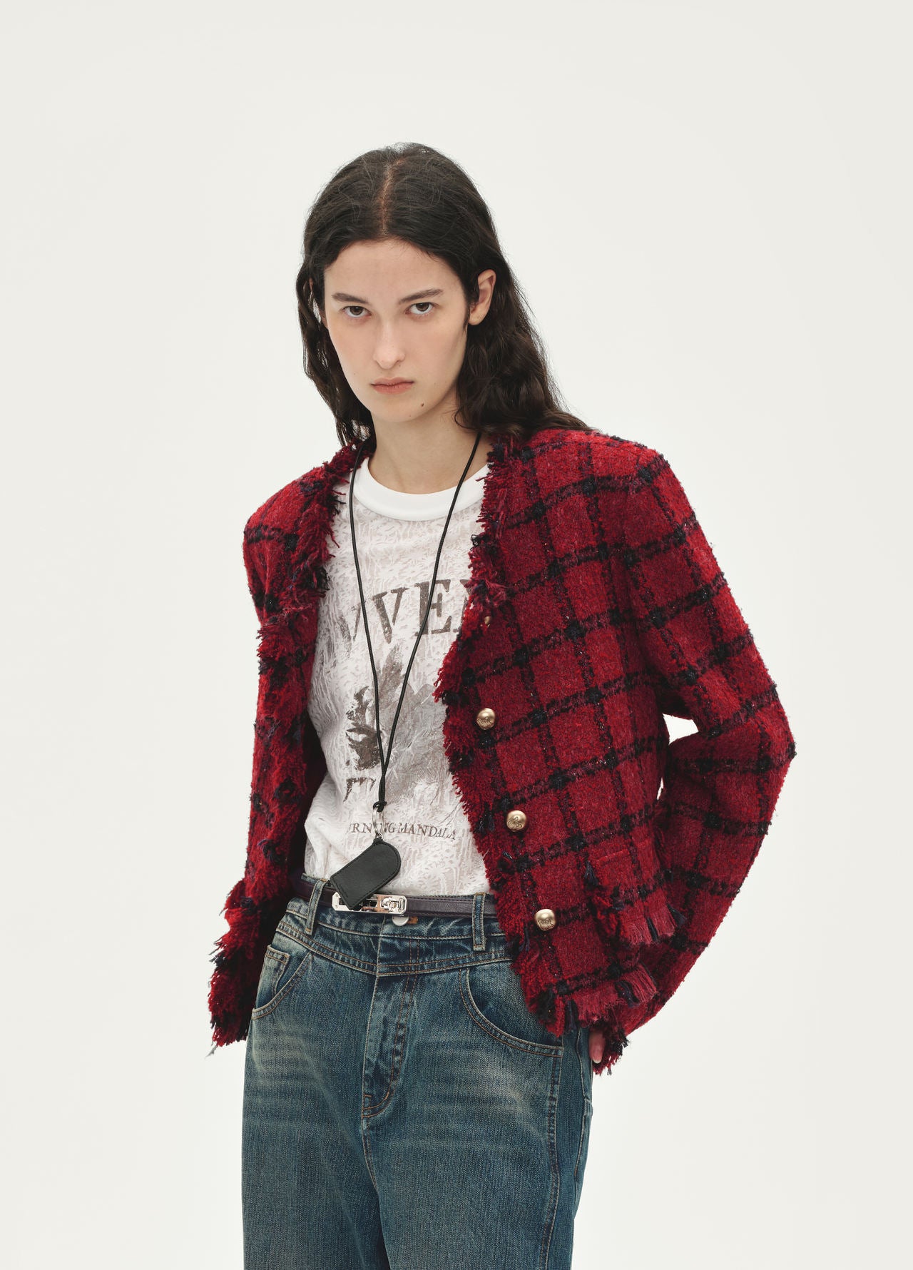 Cropped tweed jacket/red and black plaid boucle fabric/raw-edge trim/golden buttons/vintage refined French style