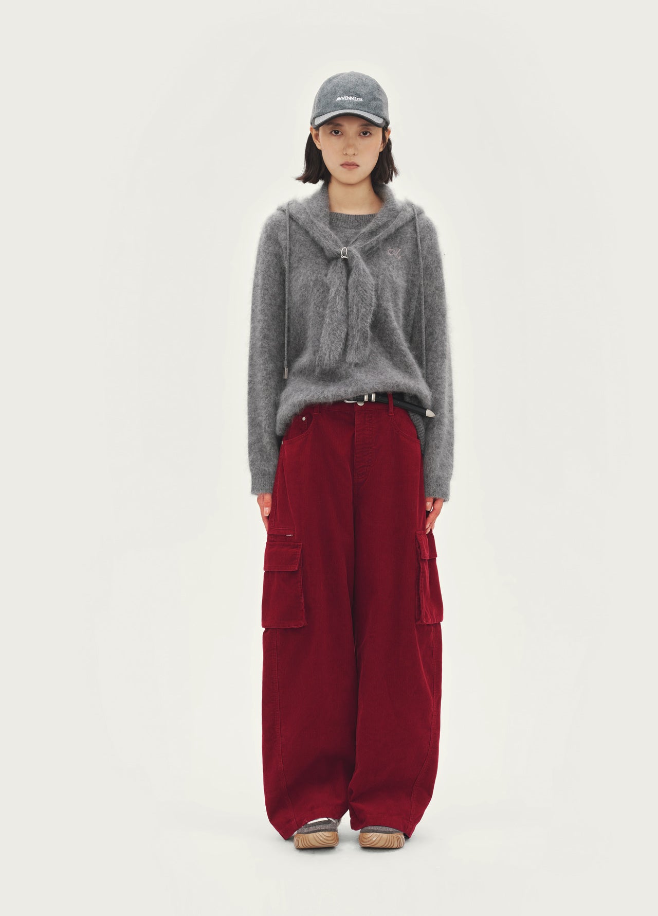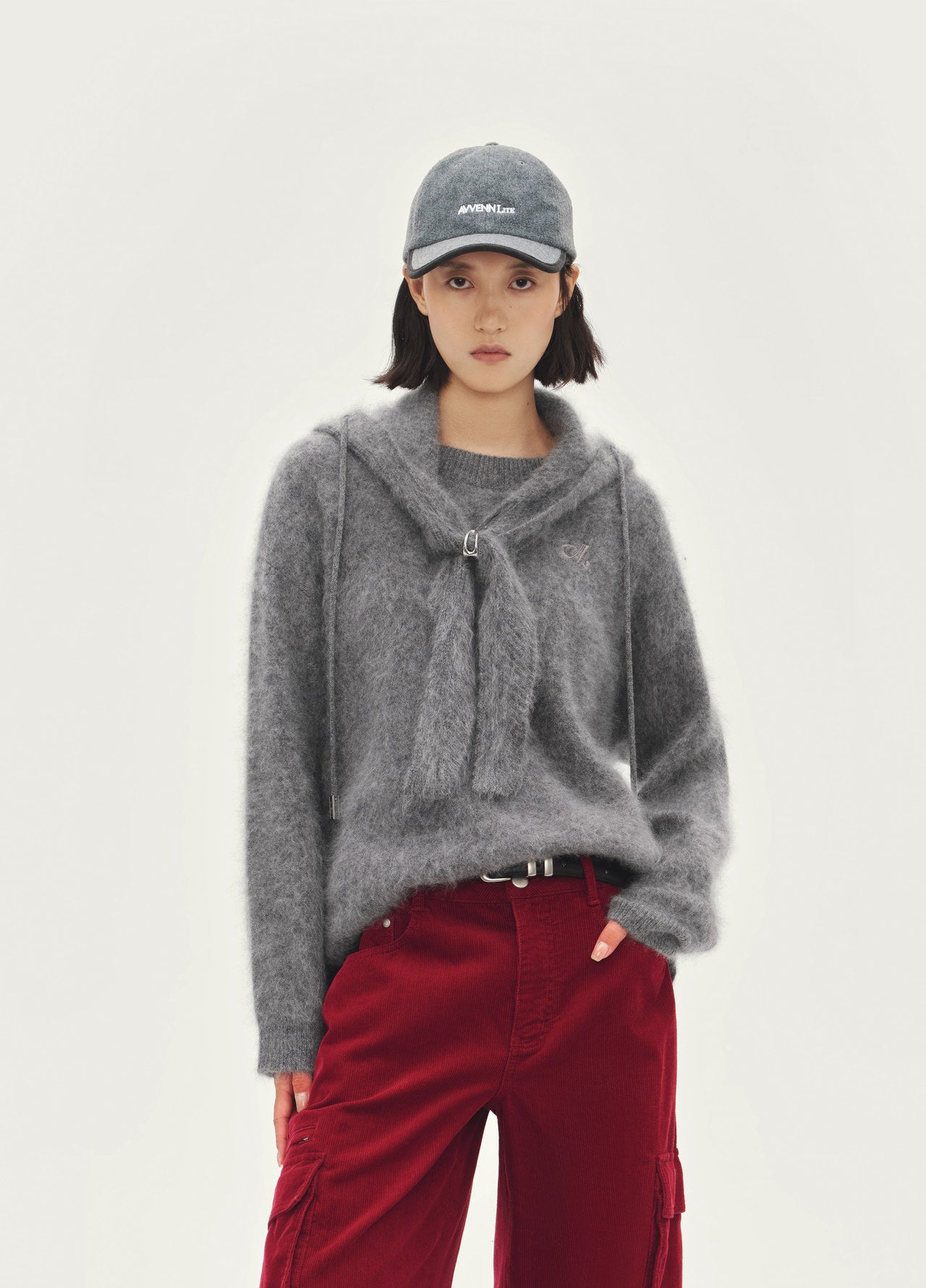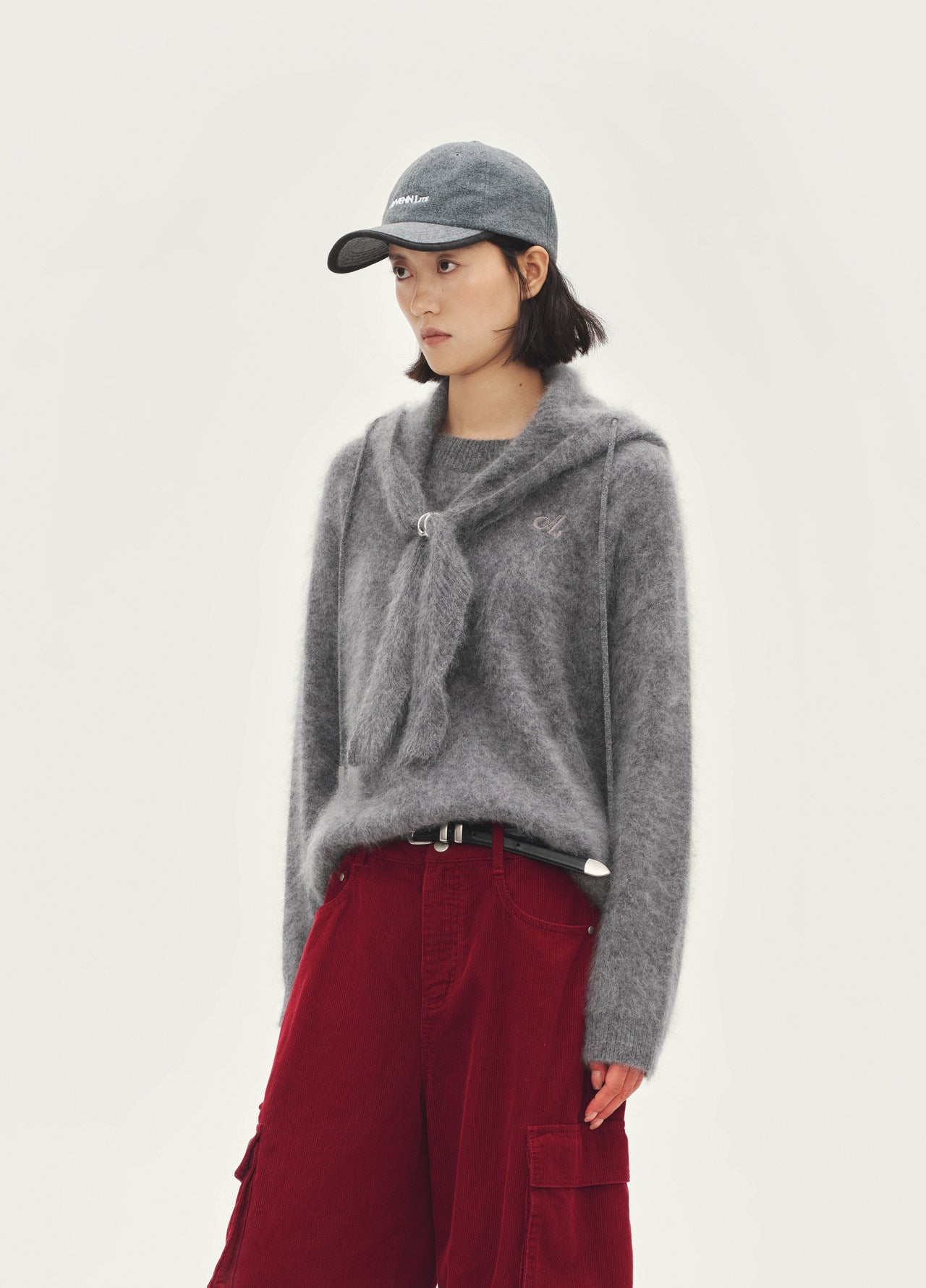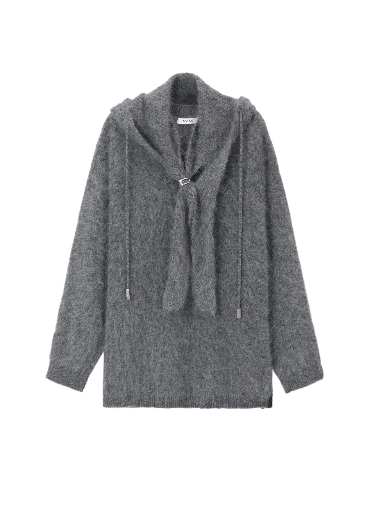 Inner crewneck sweater/gray/100% brushed wool/loose straight silhouette/soft long pile wool/logo embroidery on chest/contrast panels at hem/included hooded scarf with metal bell drawstring and matte silver ring/hybrid scarf design for styling versatility/pairs with outerwear and relaxed pants or skirts